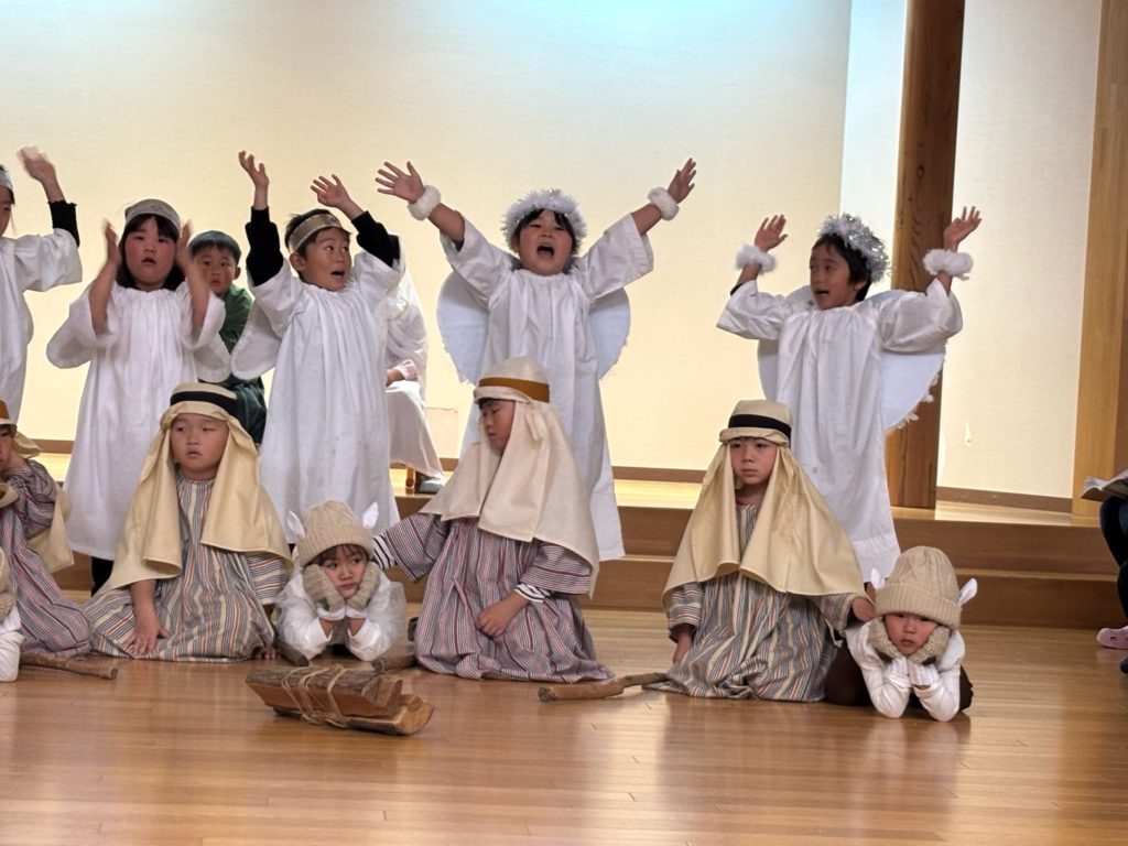 5歳児のぞみ組です。のぞみ組さんの最後のクリスマスの聖誕劇を無事終えました。13日土曜日が本番でしたが,直前にお休みの子が増えてしまい,急遽別日も設けました。 自信をもって劇を進めていく子どもたち。ほんとに大きくなったな,と感じました。成長する姿を近くで見守る事ができるのは本当に嬉しい事です。休んだ子も一緒に劇がしたい,と言う私たちのわがままを叶えて頂いた保護者の皆様、保育園の先生たち本当にありがとうございました。
