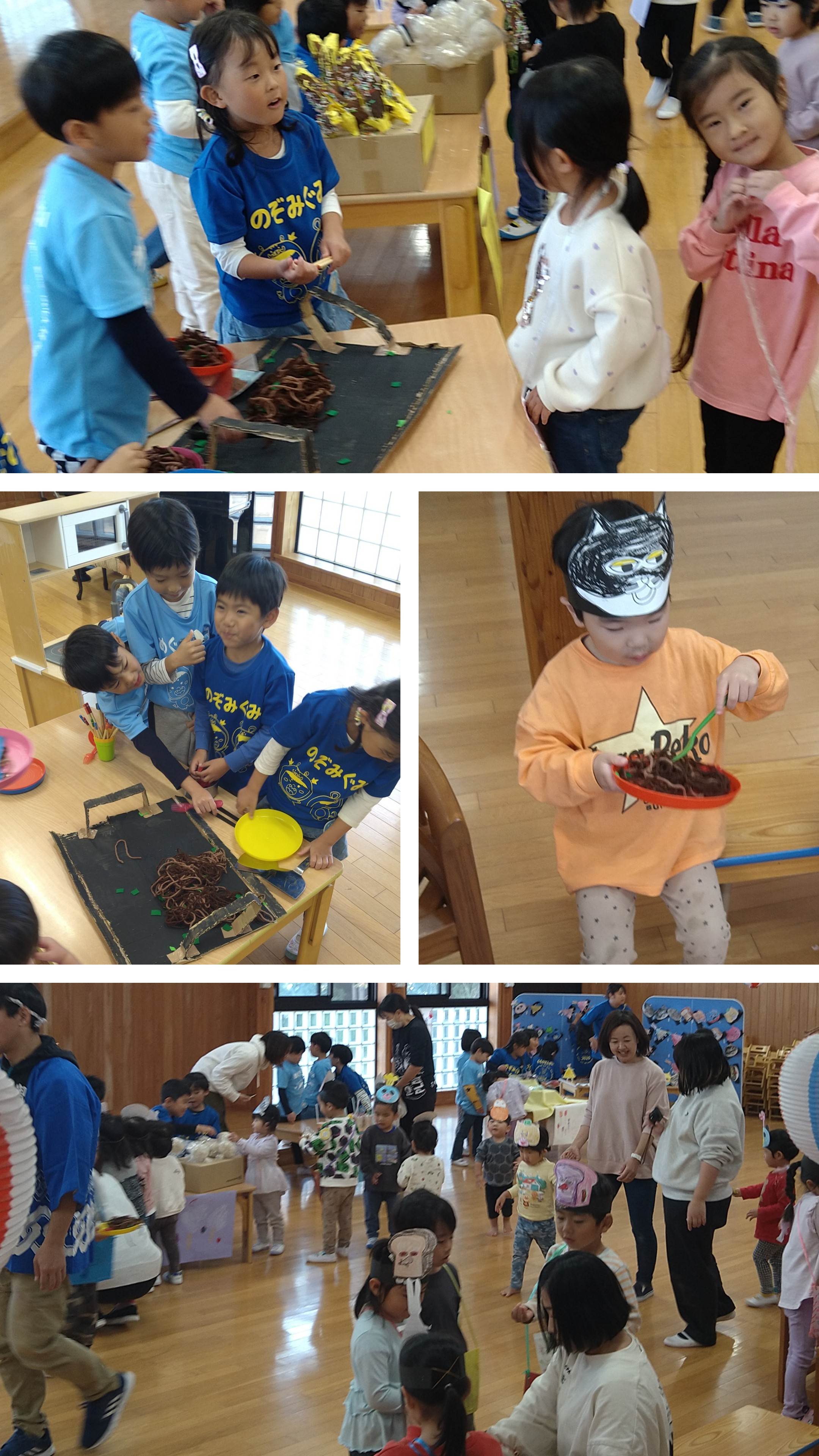 0歳児から5歳児まで、全てのクラスがその年齢に合わせ、このお祭りに関わります。先生が見本となってお買い物を楽しんだり、自分たちでお買い物バックを作って、誘い合いながらお店を巡ったり、楽しく過ごすことができました。
