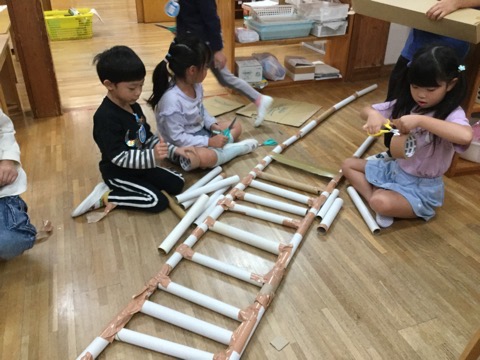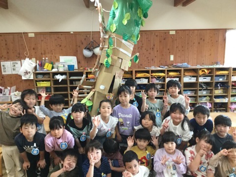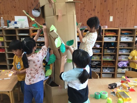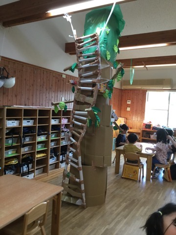 のぞみ組です。あそぼうかいで楽しんだ絵本「大きな木がほしい」の世界を、今度はみんなで作って楽しんでいます。段ボールや廃材を使い、大きい木だけではなく木に集まる生き物や、はしごもみんなで作っています。絵本と同じに、今度は小屋を作って友だちが入れるようにしよう!と計画中です。