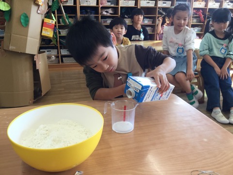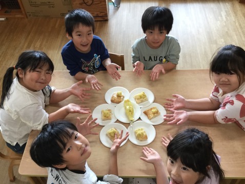 大きな木がほしいの絵本の主人公、かおるくんが小屋でホットケーキを焼いているところをみて、自分たちもつくってみたい!といって準備をしてきました。粉を入れたり、牛乳を測っていれたり、そっと混ぜたりして、ホットケーキが完成!畑でとれたさつまいもも上に乗せて、スペシャルなホットケーキができました!味はもちろん、美味しい!おかわりもたくさんしました。