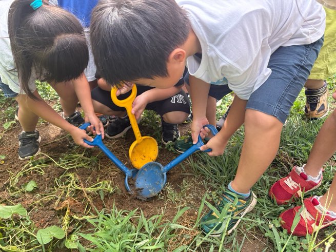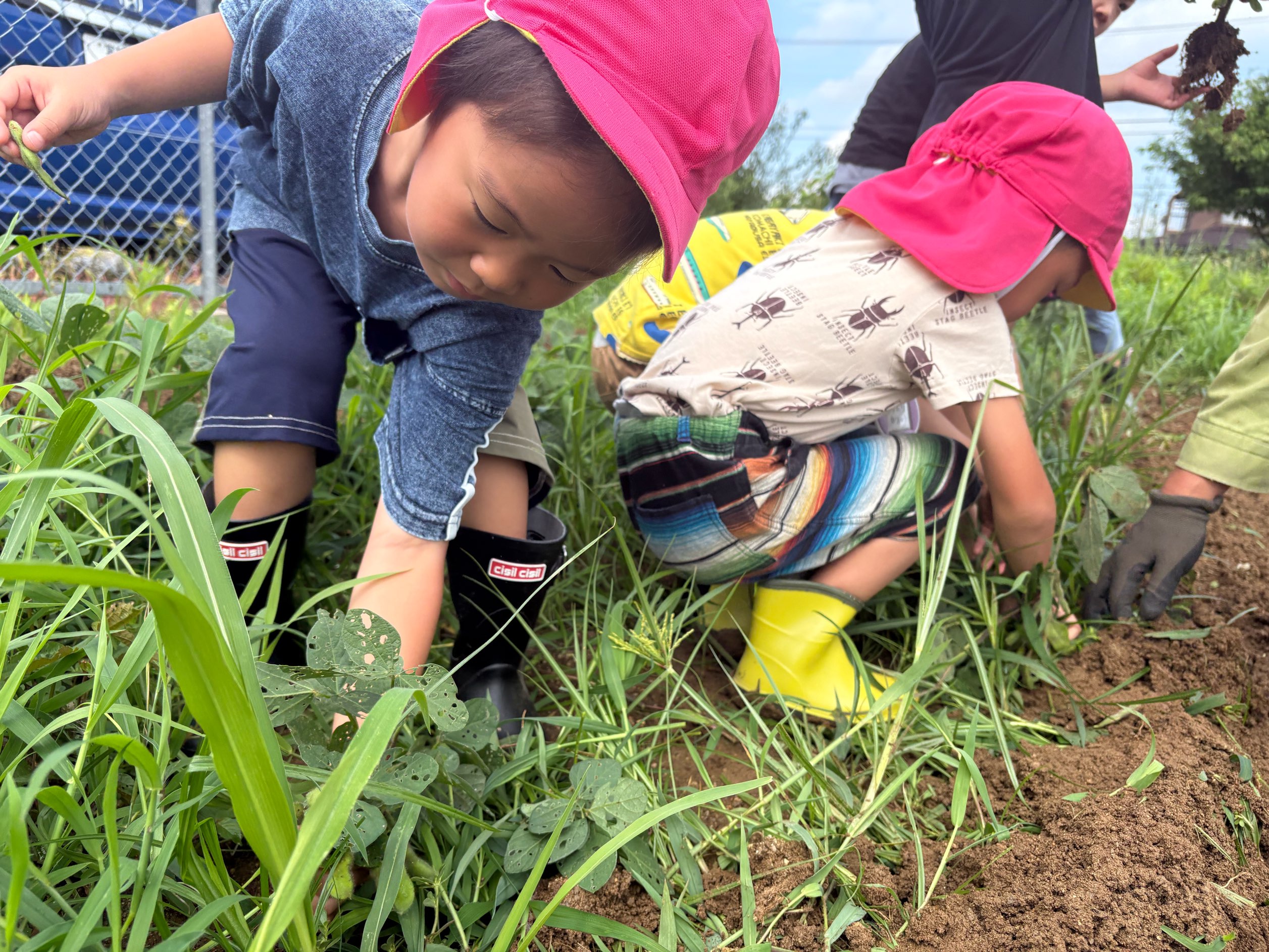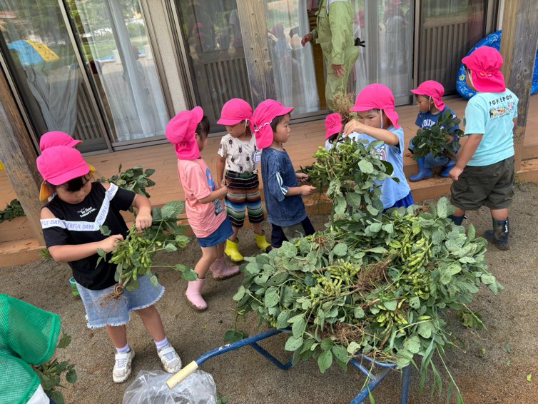 みんなで枝豆、とまとの収穫。先週見た時はまだ小さかった枝豆が立派に育っていました。とまともたくさん! 「暑いね」「枝豆抜くのは力が必要だね」「ちょっと手が痛い」「大変だ」そんな感想を言いながらも一生懸命収穫していく子どもたち。いつも食べている野菜を育てるのも収穫するのもこんなに大変なんだ、と体験できる大切な時間でした。いつもいただいている恵みに感謝しながら、ごはんの時間を大切にしていきたいですね。