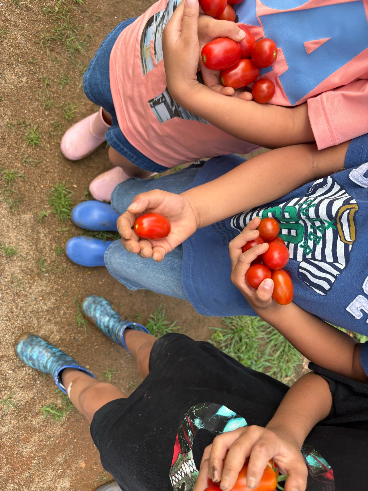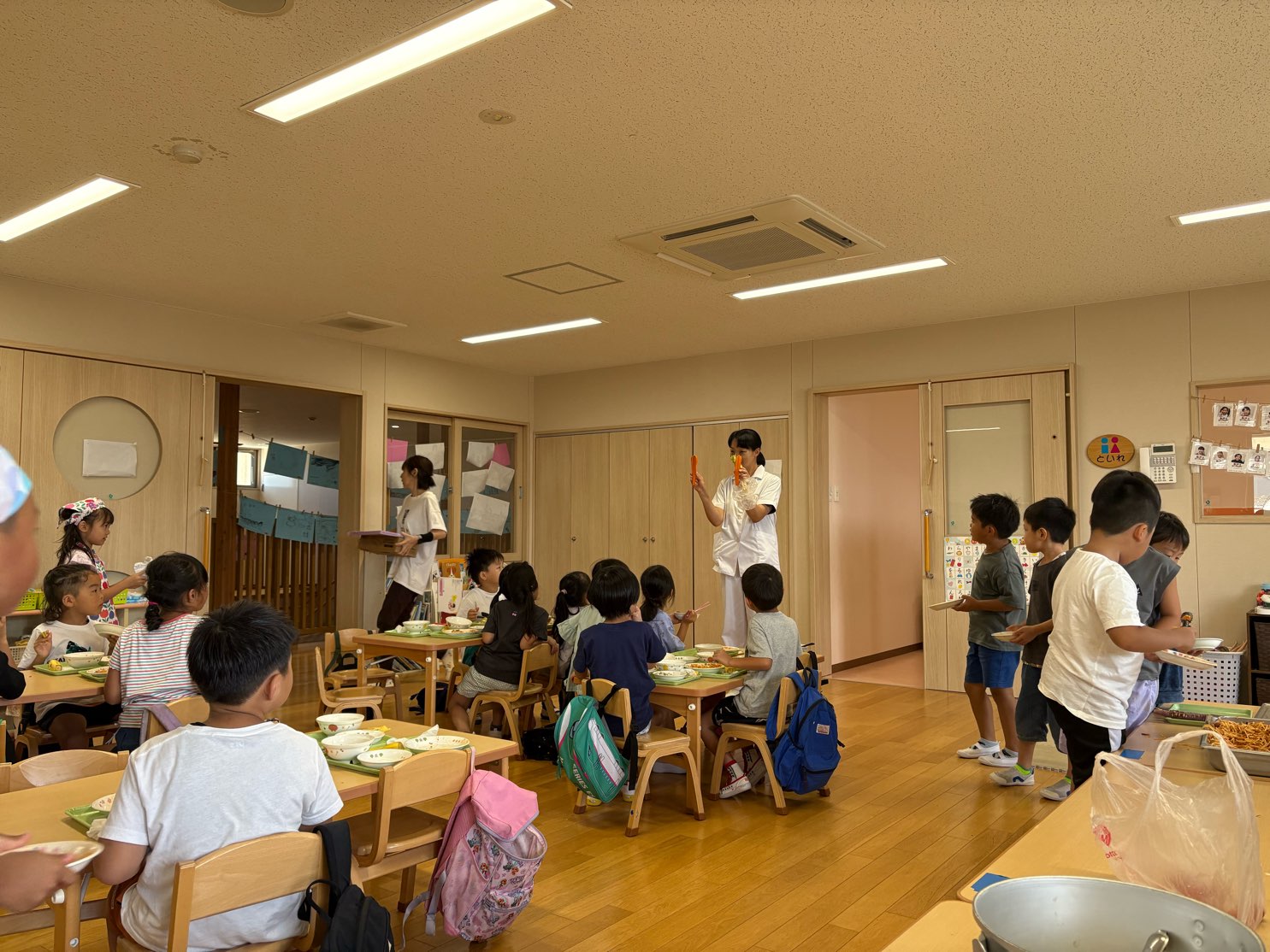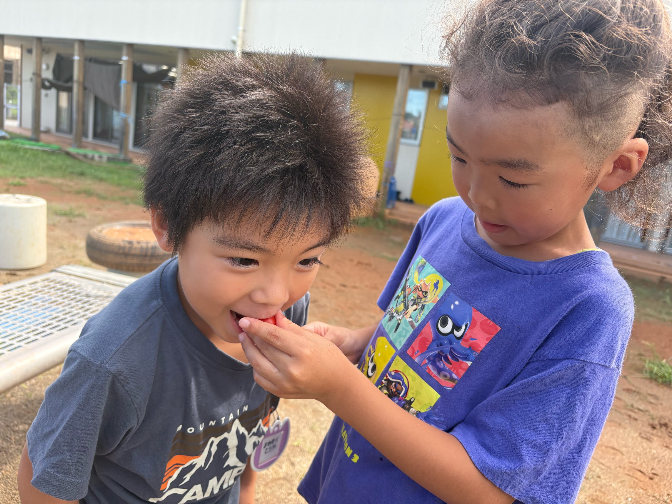 5歳児のぞみ組です!朝少し涼しかったので,久しぶりに園庭へ。 野菜がたくさん出来ていました。おひさまの光をたくさん浴びたトマトはとっても甘くなっていました。トマトを食べる手が止まりません!取れたナスは給食室へ。美味しい給食になって出てくるのが待ち遠しいです!