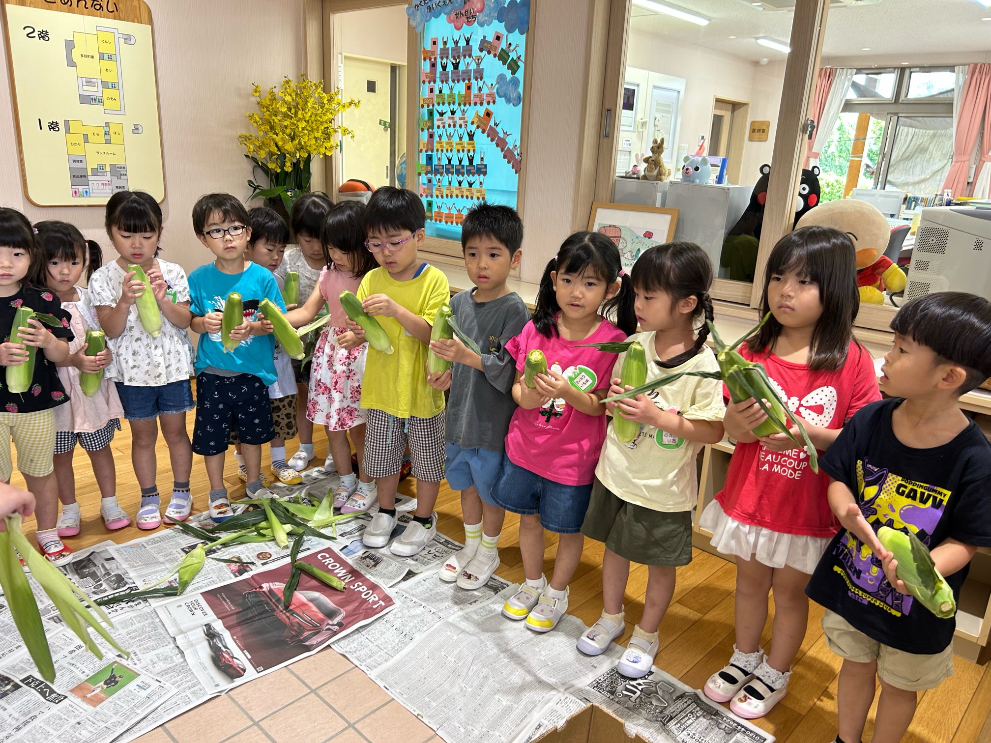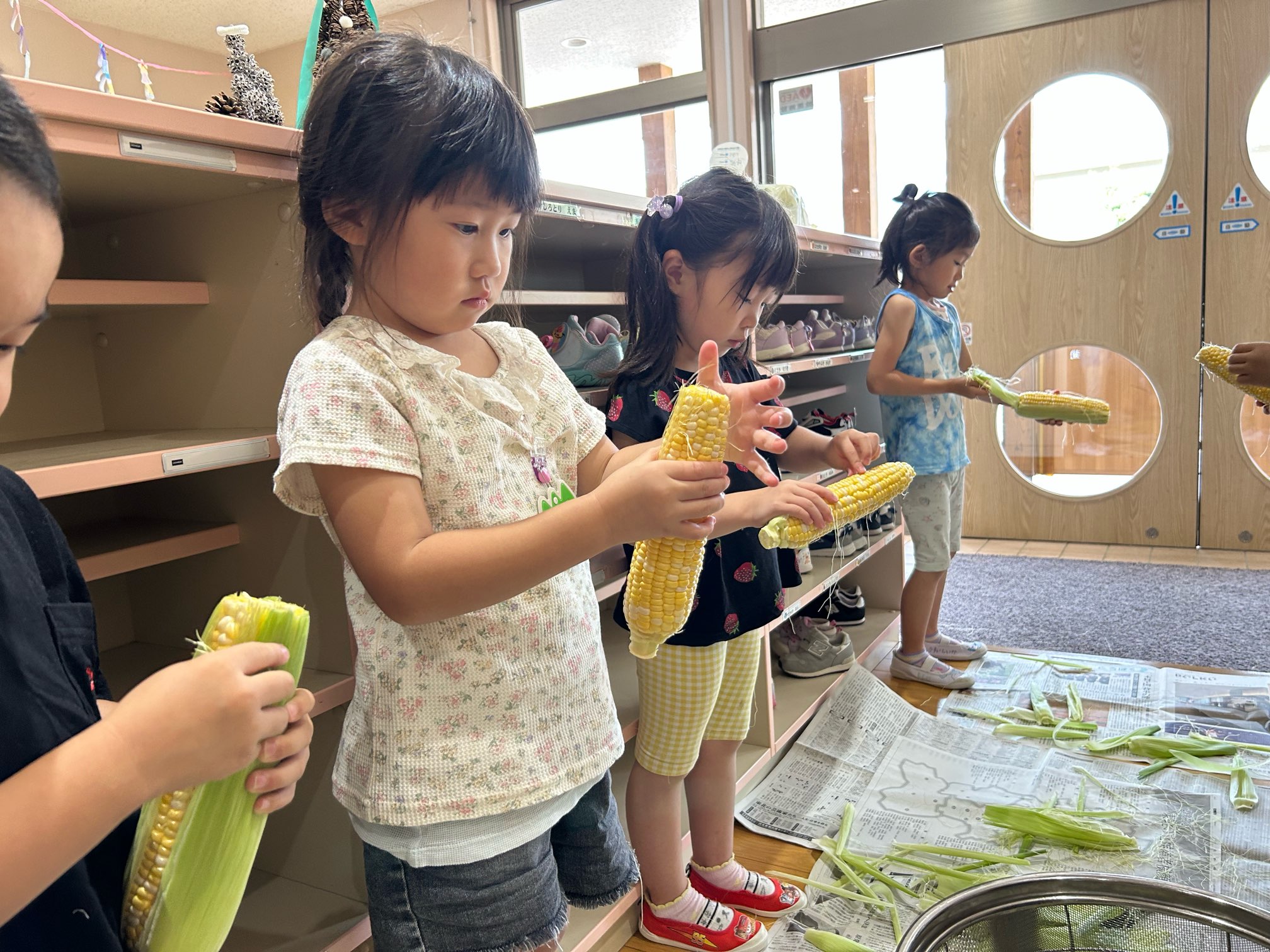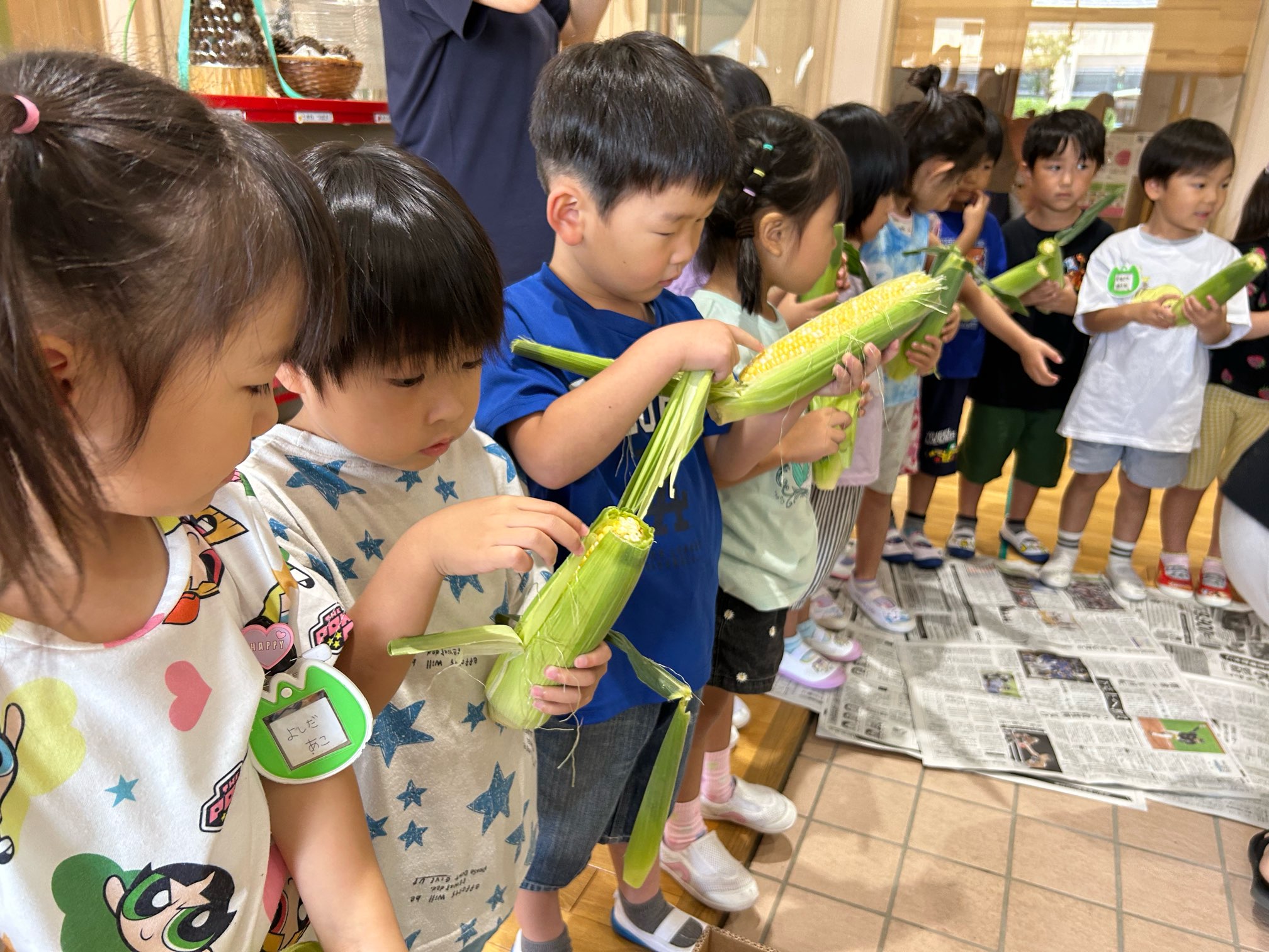 農家さんと一緒に、とうもろこしの皮剥きをしました。