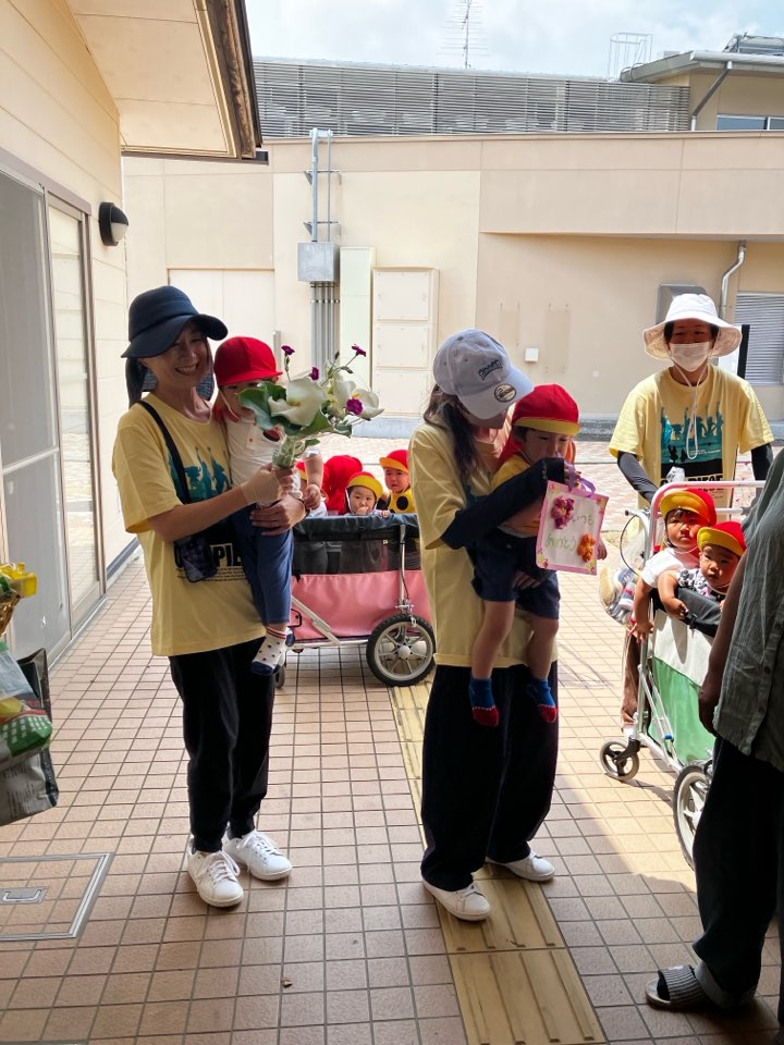 その後、日頃お世話になっている地域の方々へ、保育園で集まったお花と手作りのカードをお届けして来ました。