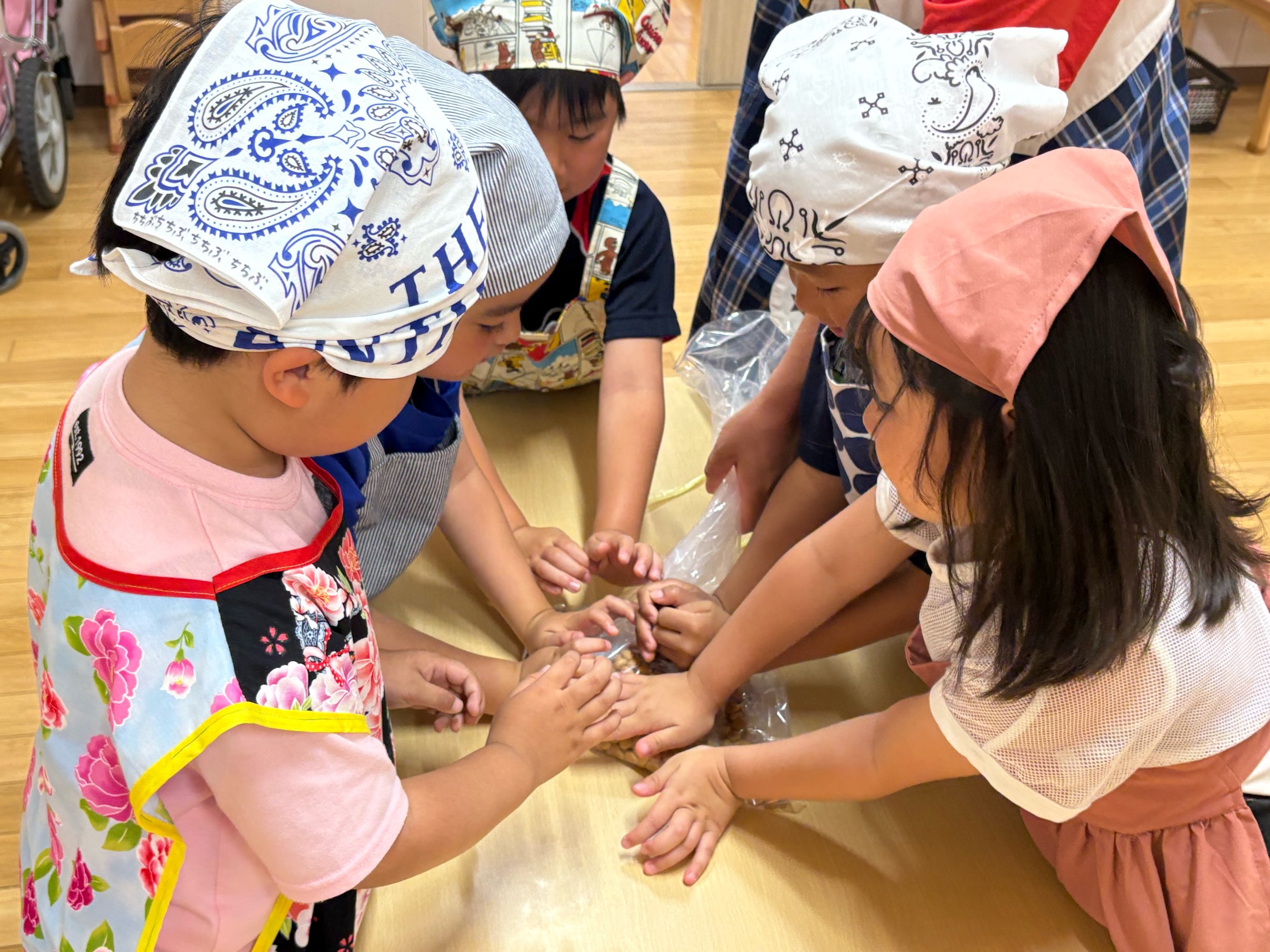 また、畑の野菜がぐんぐん育ってきました。クラス毎キュウリを味噌で食べたりもぎたての野菜を味わっています!ちょっと離れた畑で栽培していた玉ねぎは、とても大きく豊作でした!