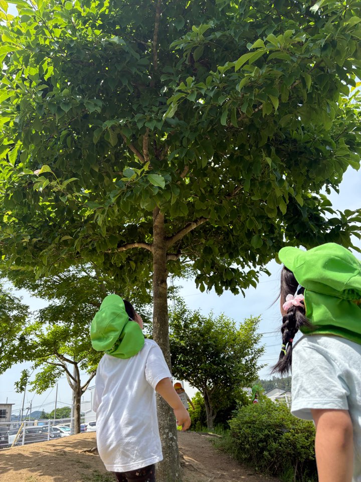 バケツのカエルに夢中になっていたのは4歳あい組のR君とMちゃん、カエルの泳ぐ姿や、バケツを登る姿に「お尻の部分だけ緑だね」「かわいい!」と発見し喜んで見ていました。しばらく見ていると喉(鳴嚢:めいのう)を膨らませて鳴く姿に更にびっくり!生き物の不思議さ面白さを実体験を通して感じたようです。