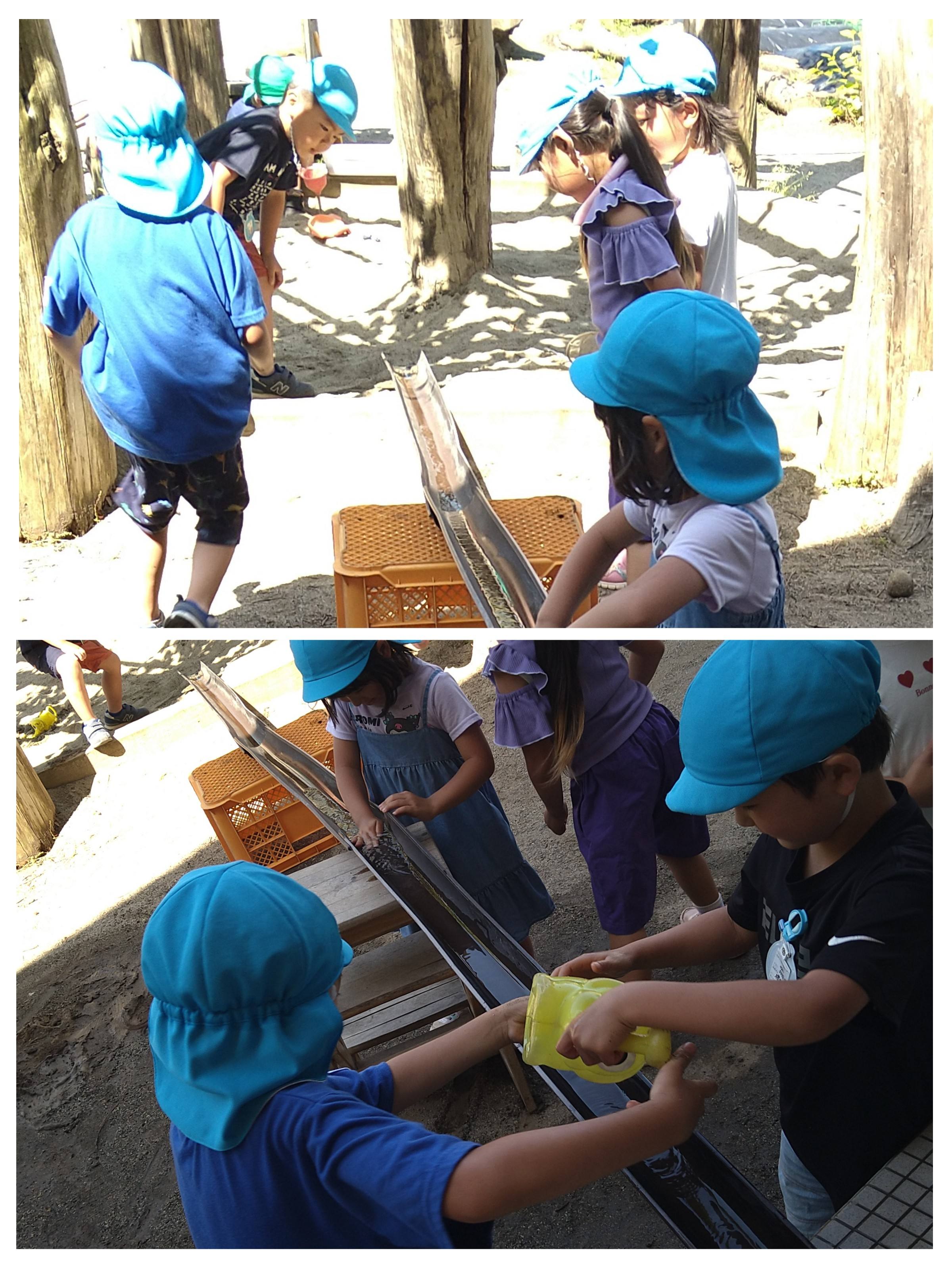 5歳児は雨樋を使い、砂場にダム?を建設中です。「流しそうめんみたい!」「こうしたら!?」「この方がいい!」など、意見を出し合い楽しそうでした!