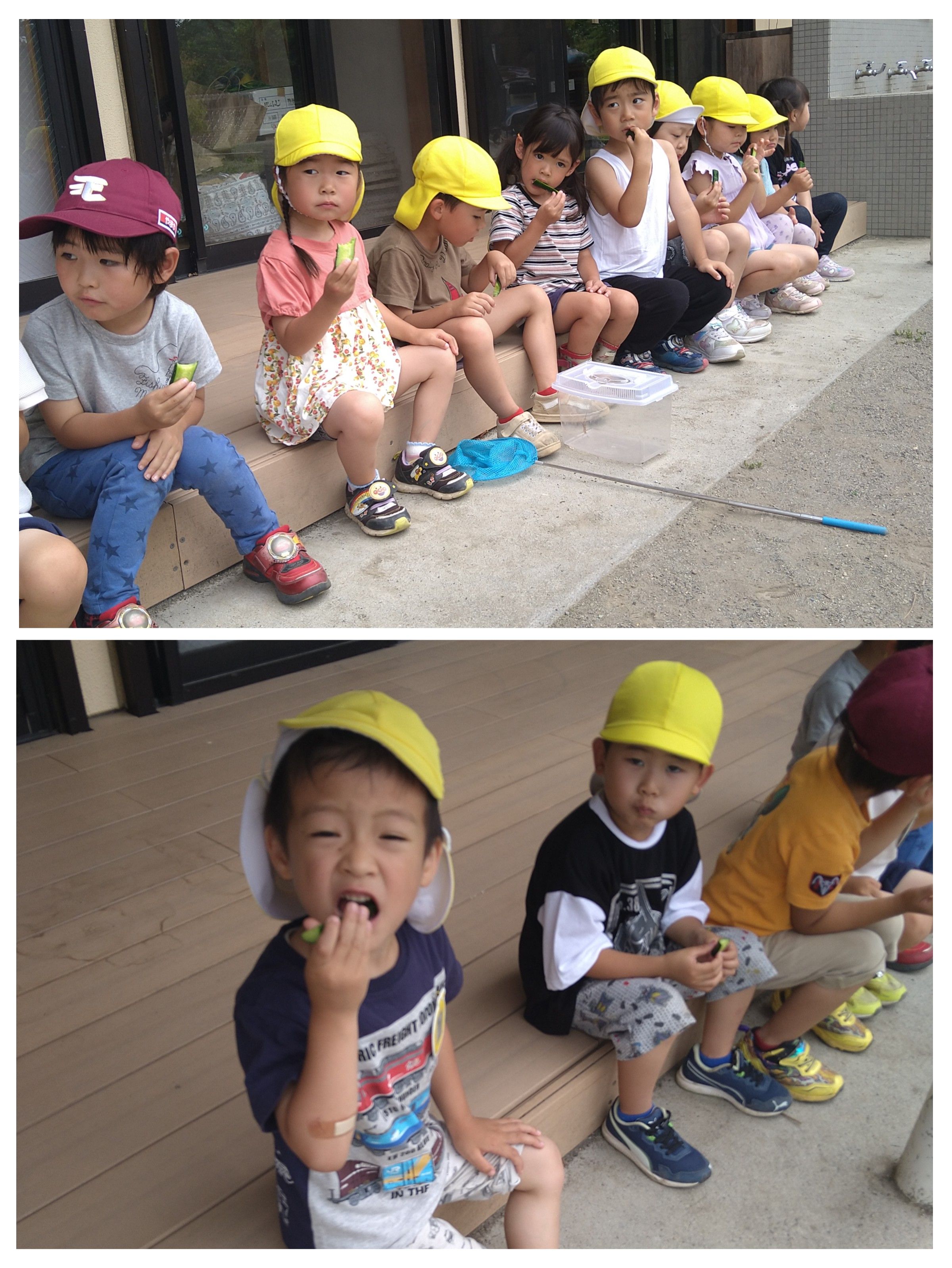 4歳児あい組は、捥ぎたてのキュウリを塩きゅりにしてポリポリッ‼ 「うんまい!」