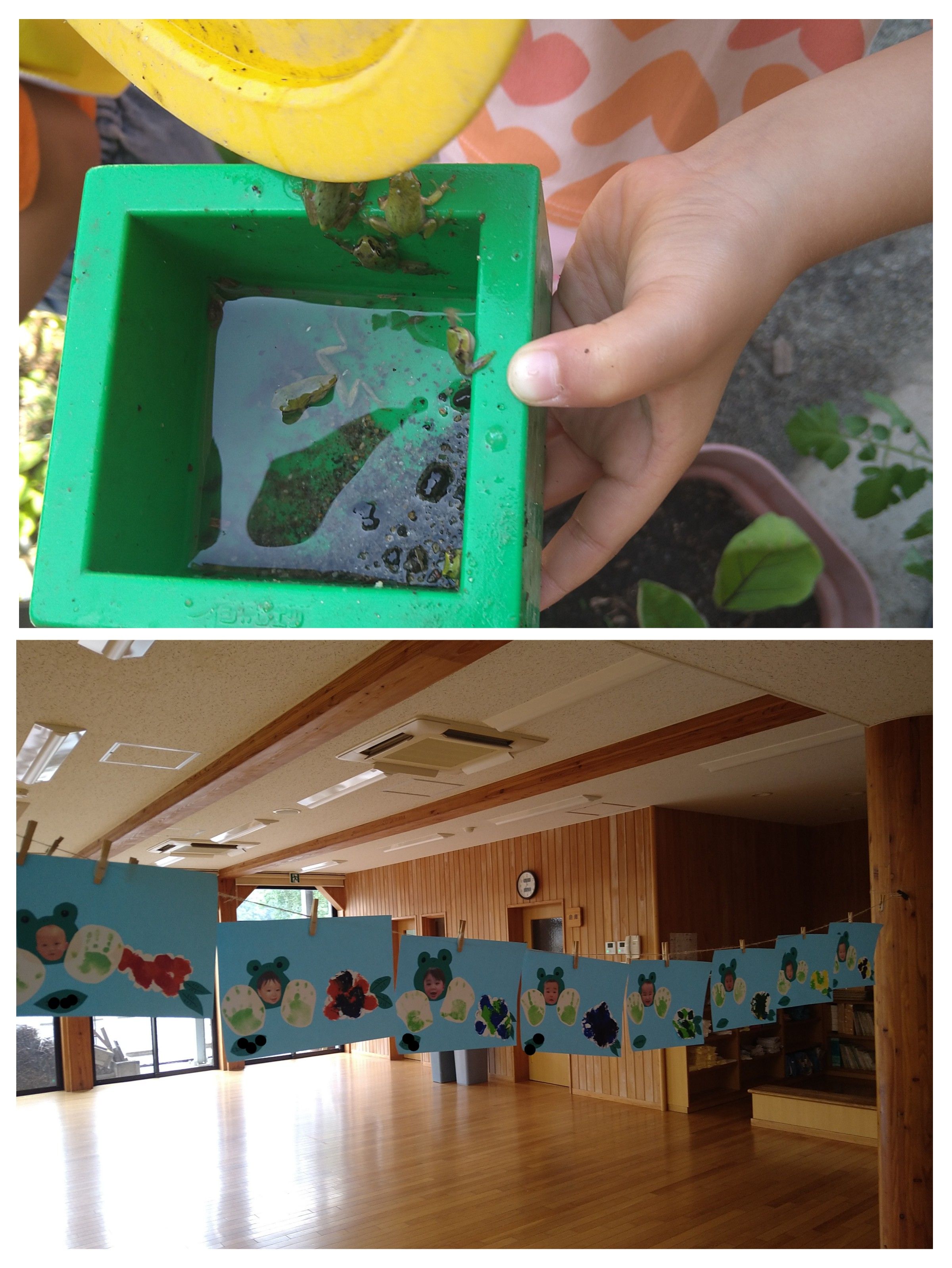 昨日の雨上がり、園庭では小さなカエルが沢山姿を見せました。この天候で、幼生が一気に成体になったのでしょうか?子どもたちは素手で捕まえることもなんのその!沢山捕まえては見せに来てくれました。ひかり組前の廊下にも可愛いカエルさんたちが並んでいました。