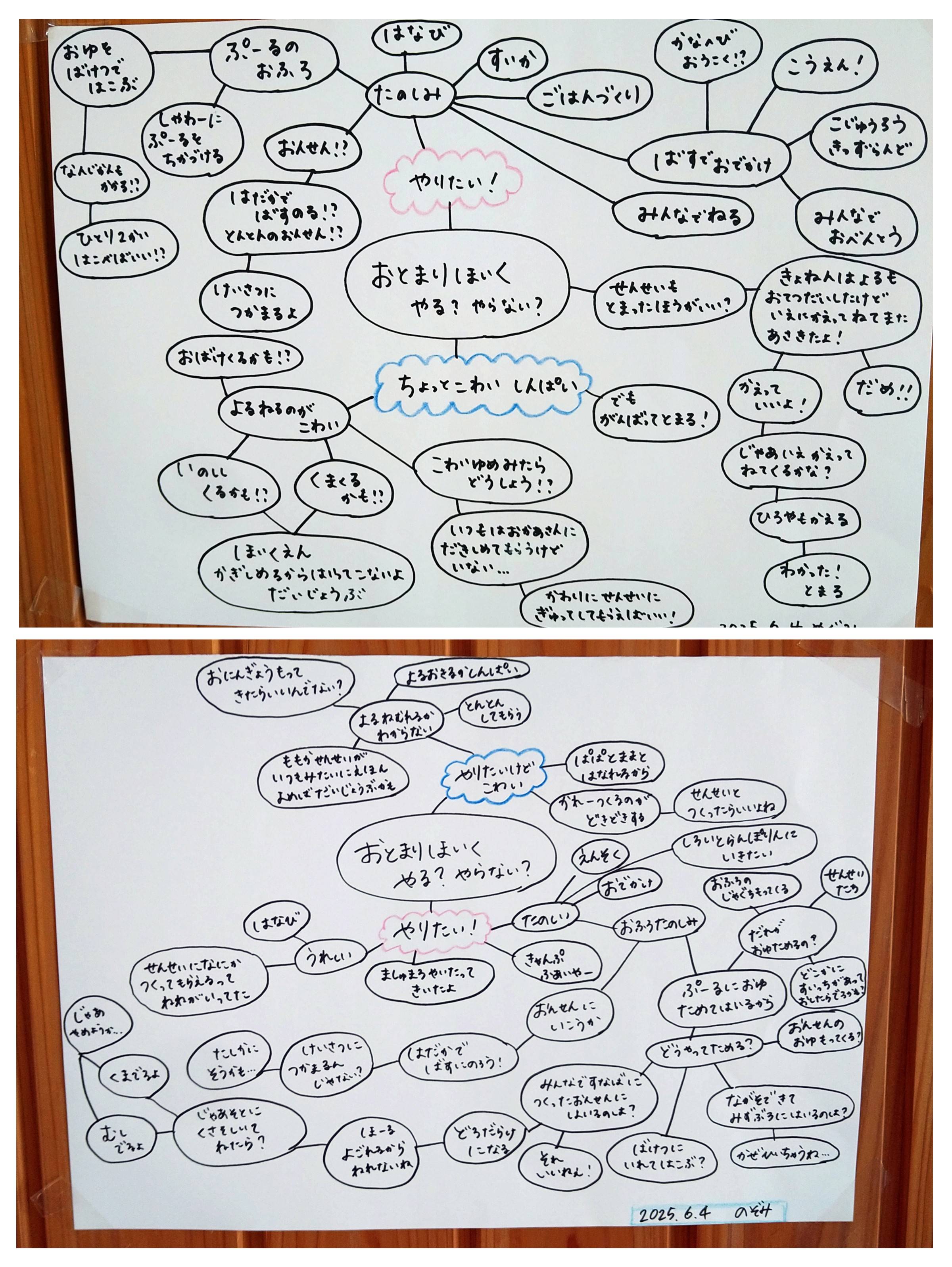 5歳児のぞみ組・めぐみ組では、7月18日・19日に行われるお泊り保育に向けた話し合いが進んでいる様子です。今年はどんなお泊り保育になるのか、また、どんな成長を見せてくれるのか今から楽しみです。2階ホールの壁には、話し合った内容が掲示されてイメージも膨らんできているようです。