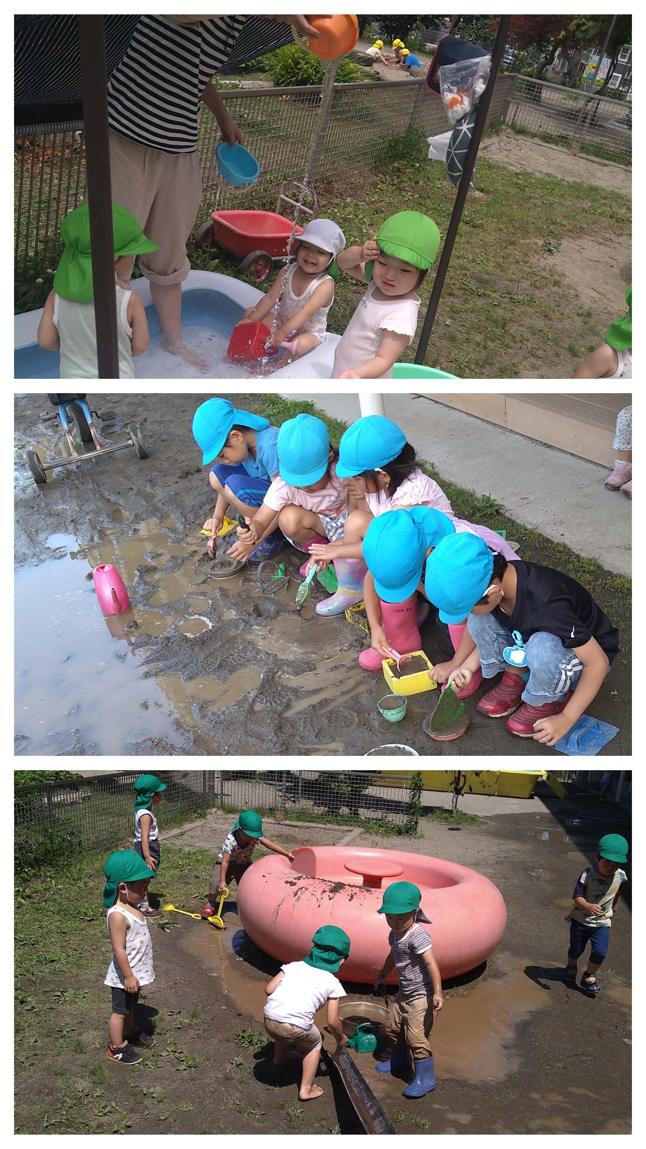 今週も梅雨の中にありながら、毎日の暑さに気を付けながら保育をしていました。雨上がりの泥遊びではケーキ屋さん、チョコレート屋さん、アイス屋さんなど、滑らかな泥を自分の好きなデザートに見立てて夢中になっていました。