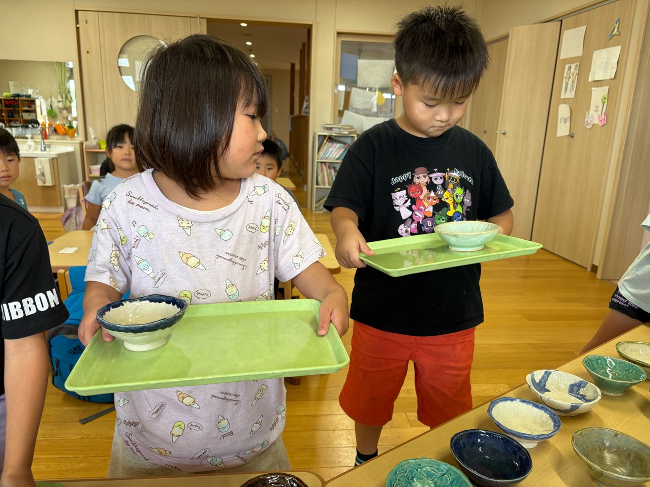 みんなで自分で作ったお茶碗を使って給食の時間を過ごしました。
