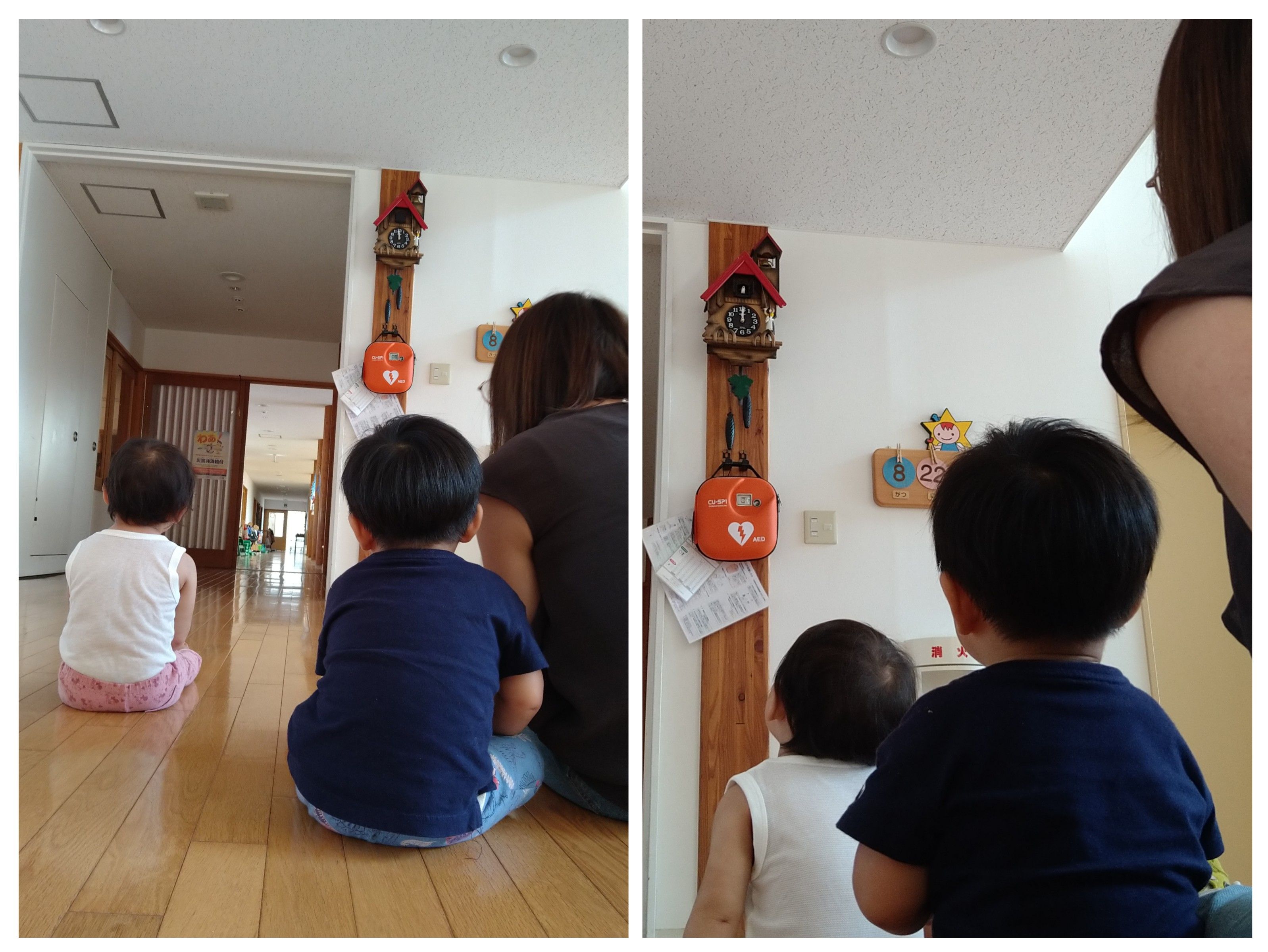 保育園の玄関ホールには鳩時計が掛けられているのですが、時々12時前になると、可愛らしい光景を見ることがあります。それは、鳩時計の鳩を見に集まる子どもたちの姿です。「ぱっぽう!ぱっぽう!」言いながらじーっと小窓を見つめているのです。「ぱっぽー!」と一鳴きするととっても嬉しそうにしながら、視線は見つめたまま12回目の「ぱっぽー!」が終わると「ばいば~い」と手を振ってお別れをしています。「こわい!」という子どももいますが、見れるようになるのも成長だなと感じ微笑ましく思います。