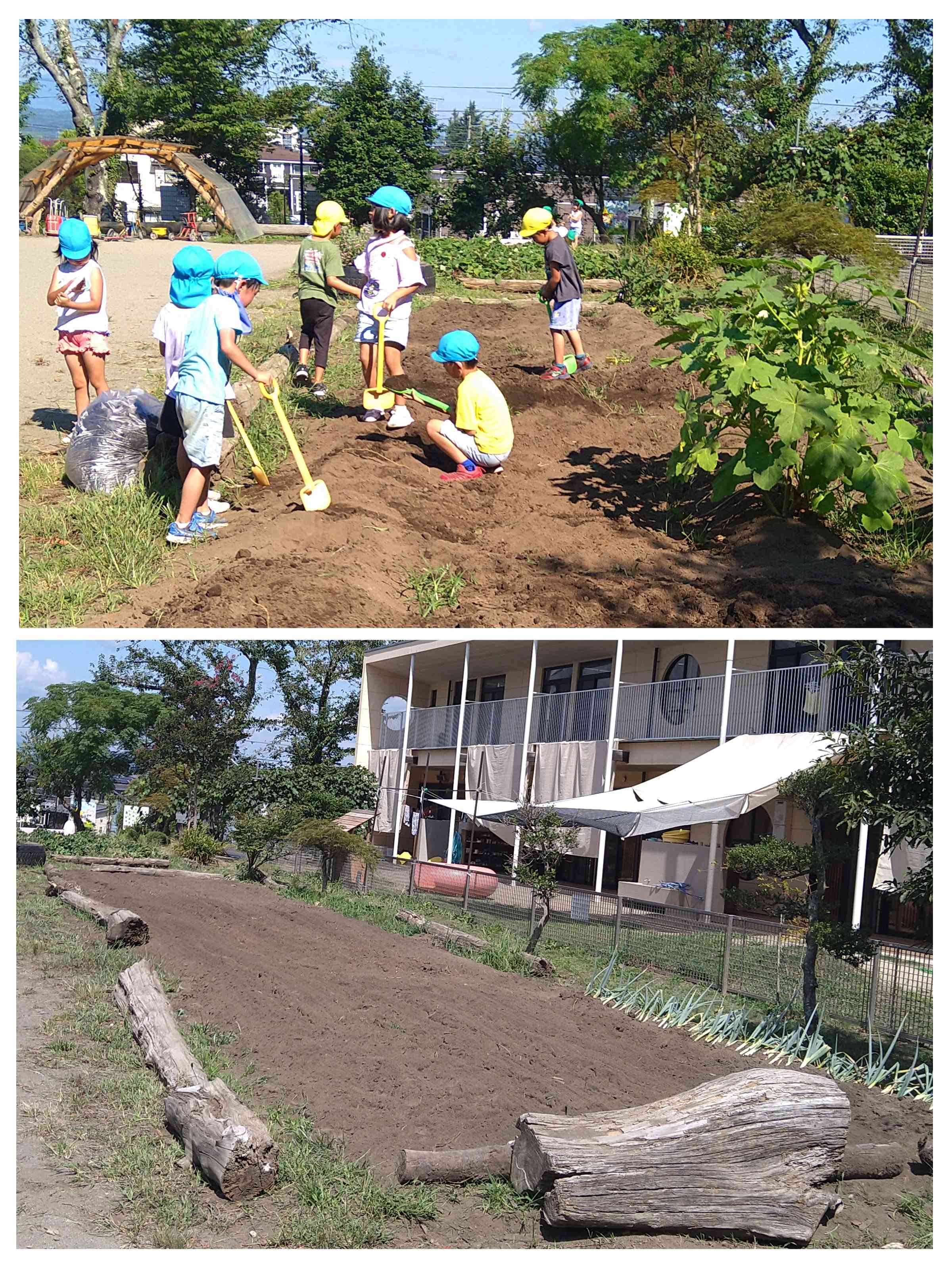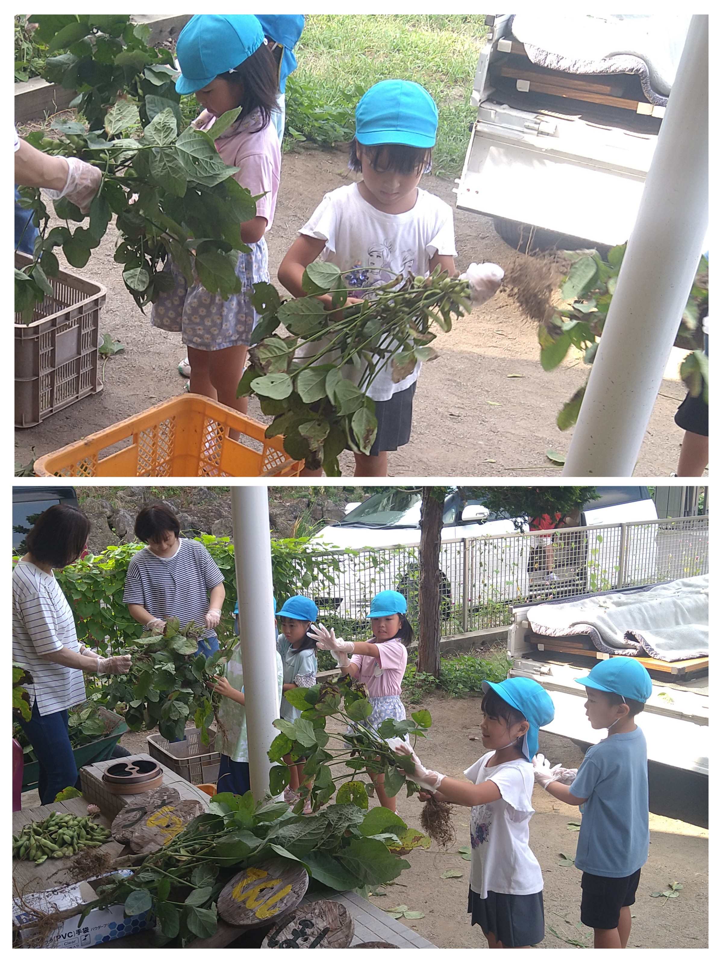 毎日子ども達と生活をする中で、子どもたちのパワーに助けられることが度々あります。ねぎの植え替え作業では、古い皮を剥き、畝に並べて土をかける作業を、「ぼくもやる!私も手伝う!」と、20分足らずで済ませてくれました。また、枝豆を軽トラック1台分収穫し、園に戻った時には、「園長先生何するの?」と集まってくる子どもたち。先生方の見本を見ながら、あっという間に枝から採り、分別もしてくれました。夏野菜を収穫し終えた園内の畑も、喜んでシャベルで耕し、「あと何する?」と頼もしい言葉。管理機もかけ次の準備も万端にしました。