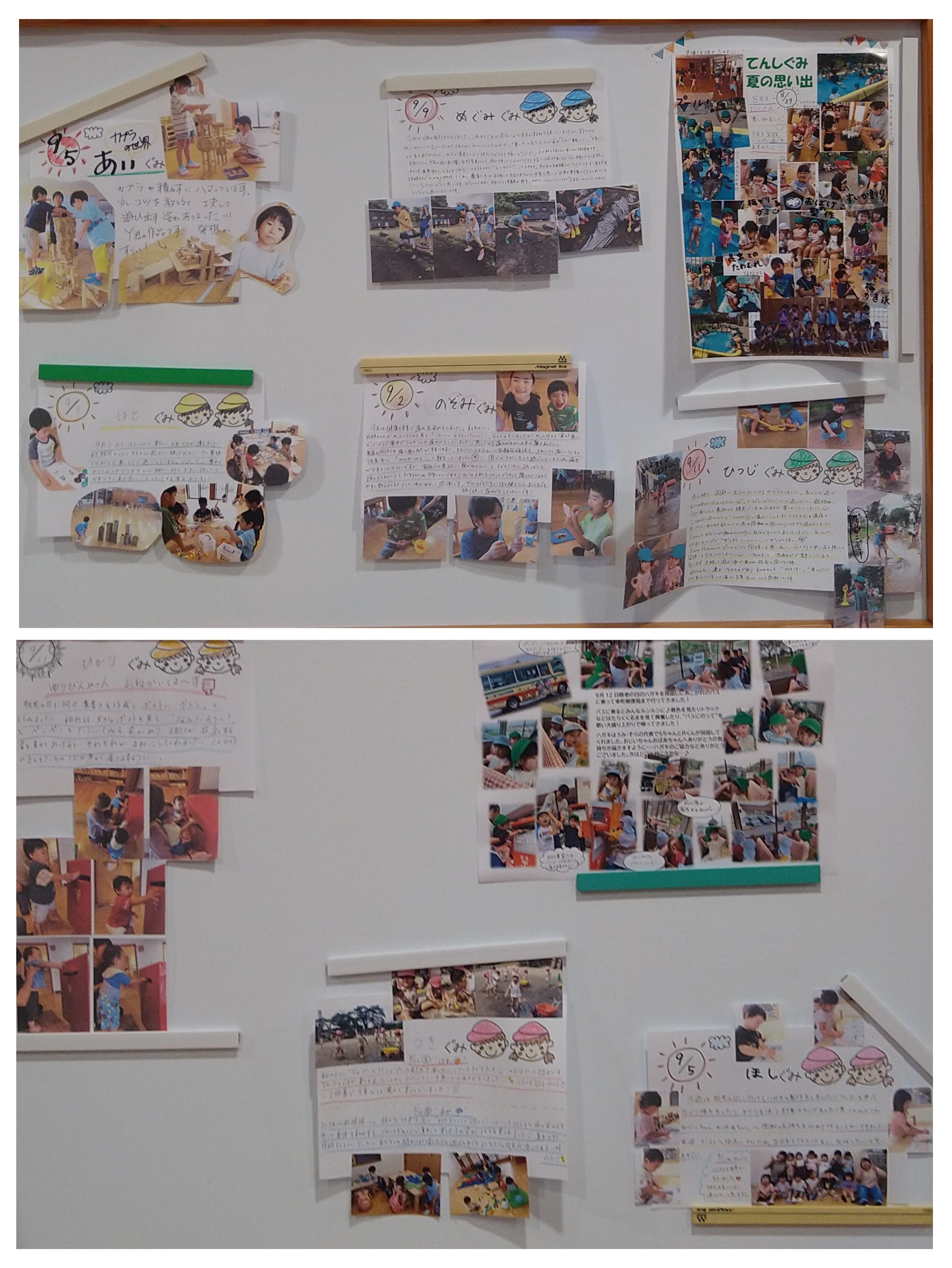 職員室前には、日々の保育の様子を掲示していますので、ぜひ立ち止まってご覧ください。