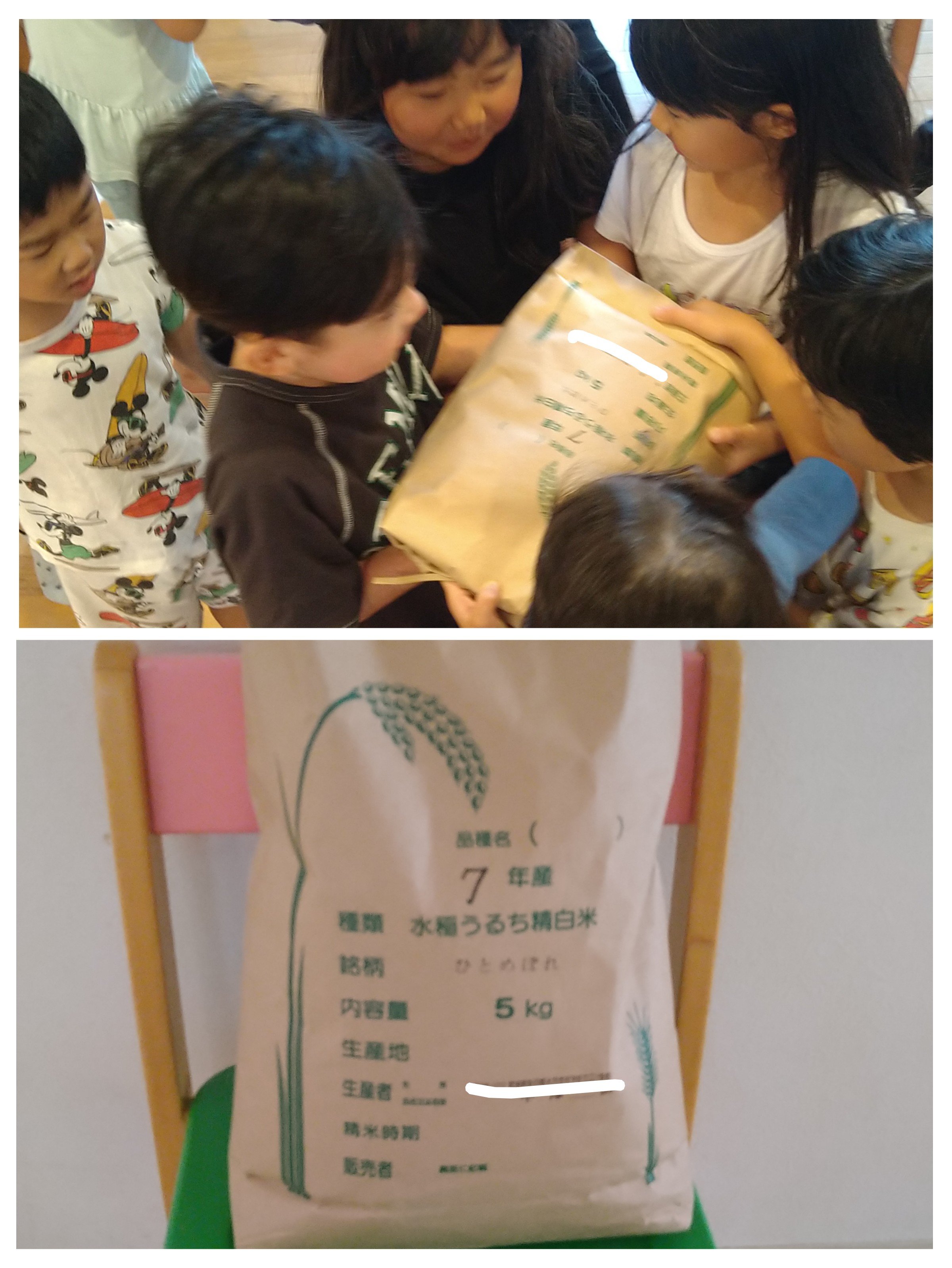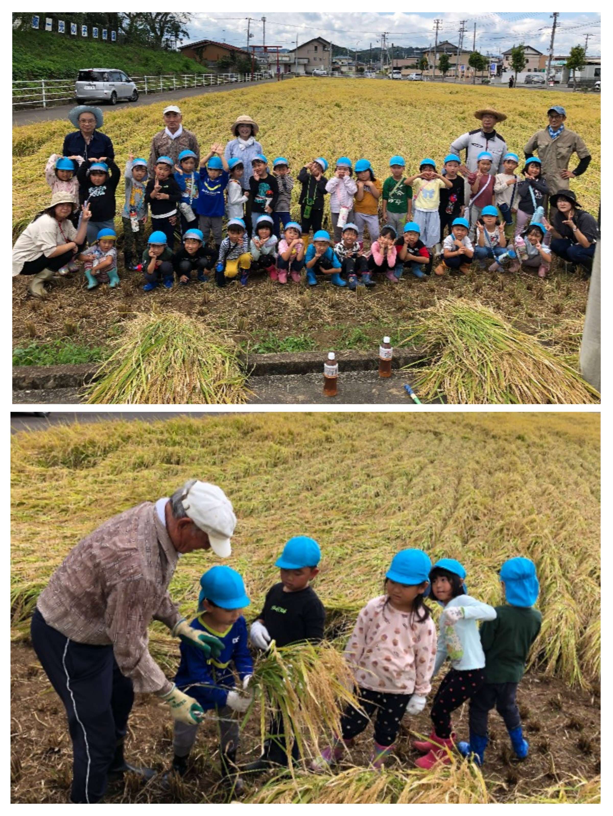 9月9日(火)に5歳児のぞみ組、めぐみ組の子ども達は稲刈り体験をしました。地域の農家さんに教えていただき、鎌を使って一株一株”ぐっ”と力を入れて刈り取ることができました。その後、園に戻ると、コンバインが登場しあっという間に刈り取っていきました。今日は収穫したお米をHさんが届けてくださり、子どもたちは大喜びでした。今後は園庭で羽釜を使って新米を味わいたいと思います。この様な体験を快く引き受けて下さる地域の皆様、Hさんに心から感謝いたします。今後も園に関わる様々な方達との繋がりを大切にしていきたいと思います。