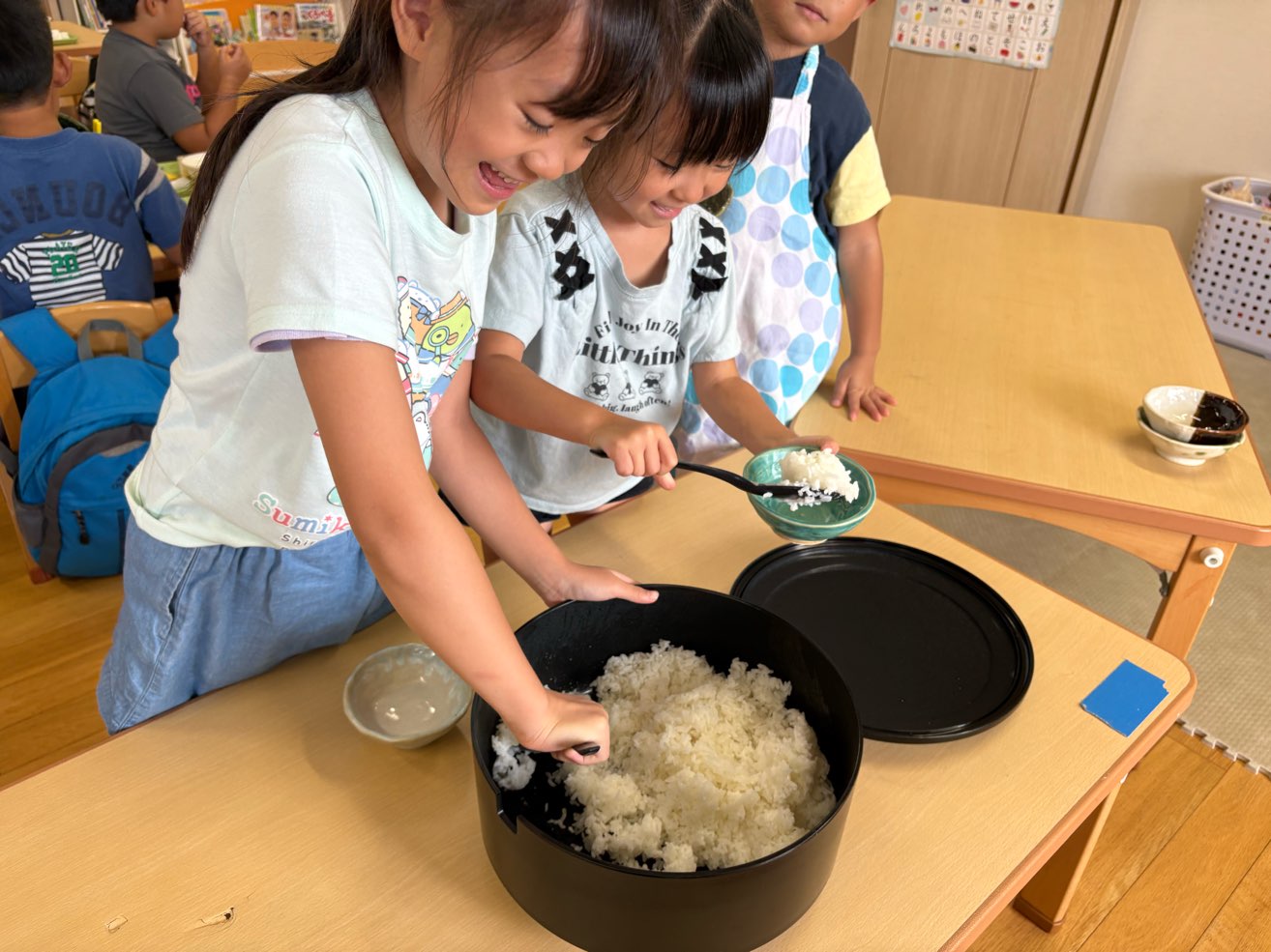 大事そうにそーっと、そーっと持つ子どもたち。ご飯をお茶碗に取るときもにっこにこ♡
