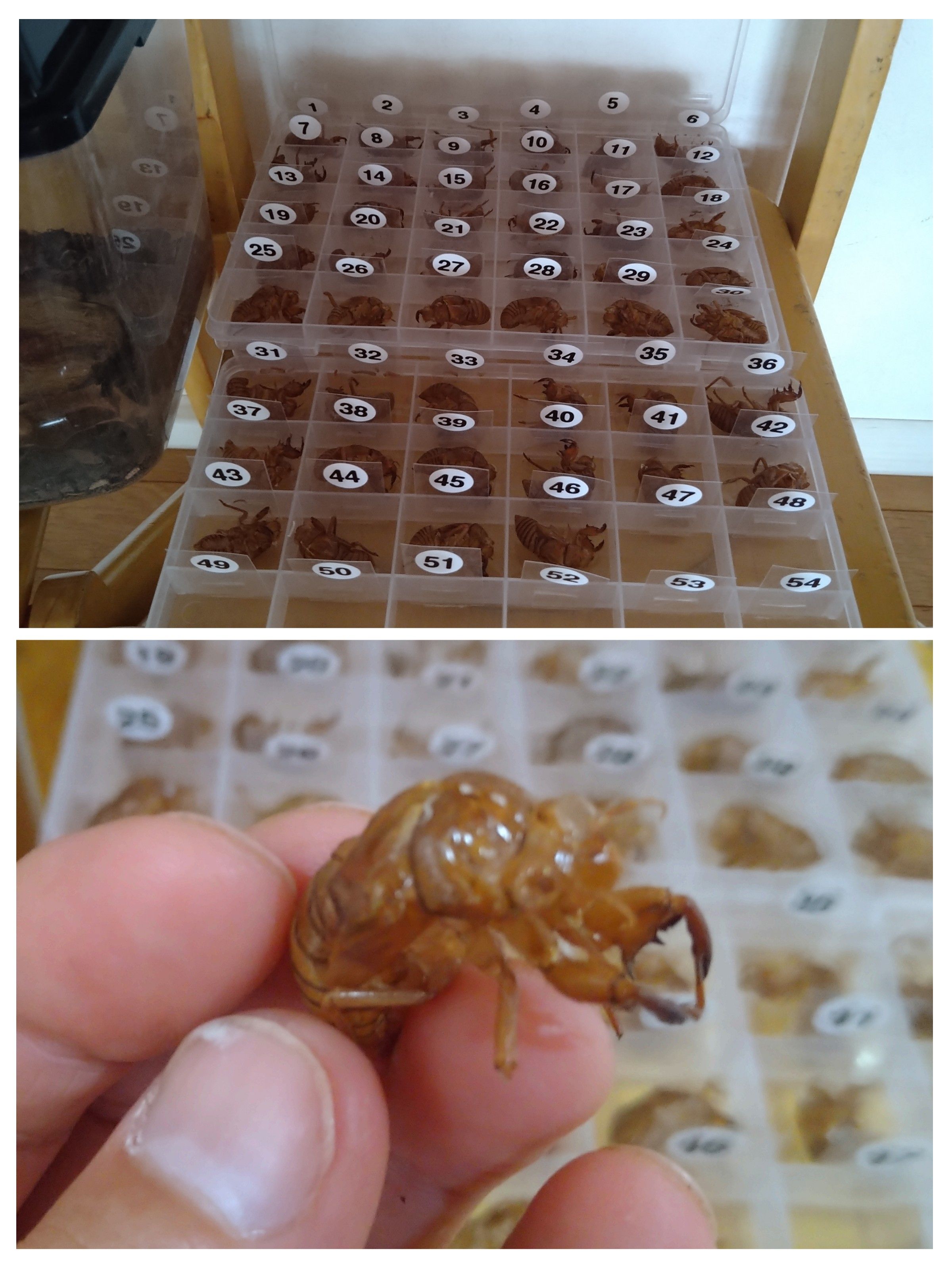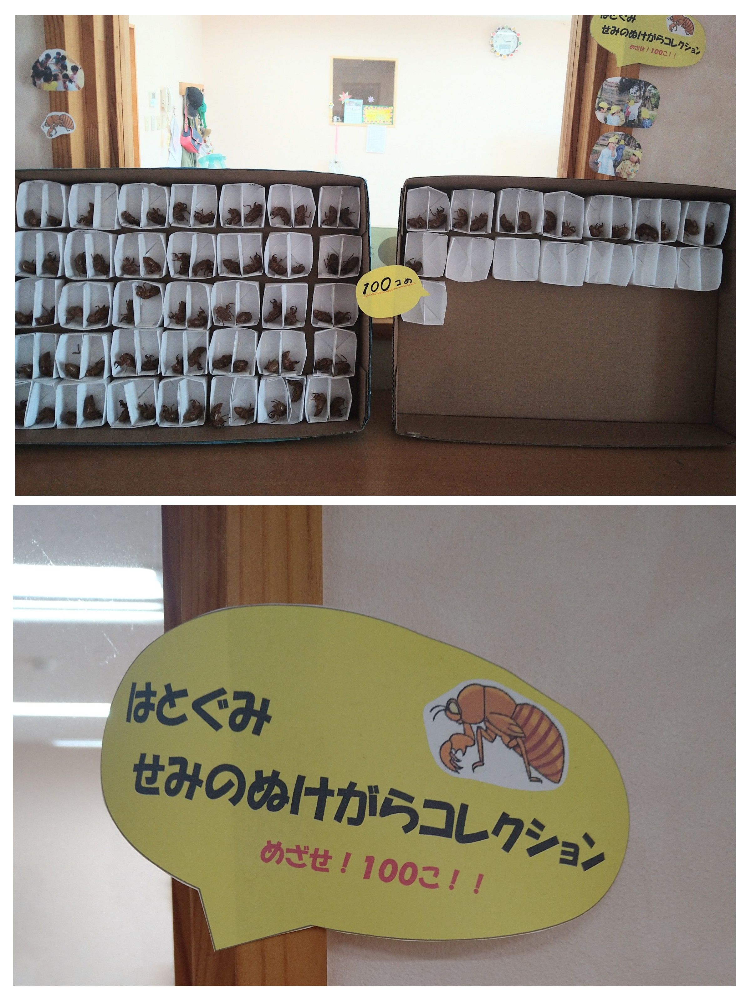 連日うだるような暑さの中、子どもたちは元気に過ごしています。今日も30度を超える中、園庭では水遊びや虫探しに夢中になっている子どもたちでした。4歳児あい組・はと組では面白い挑戦をしています。それは、セミの抜け殻をどれだけ集められるかというものです。セミの抜け殻を良く観察すると、とても奇妙な姿ですが、その形の不思議さに感心してしまいます。子どもたちは目指せ100個!と、毎日増え続けています。こうして10以上の数や「100」という大きさを知るきっかけにもなっています。