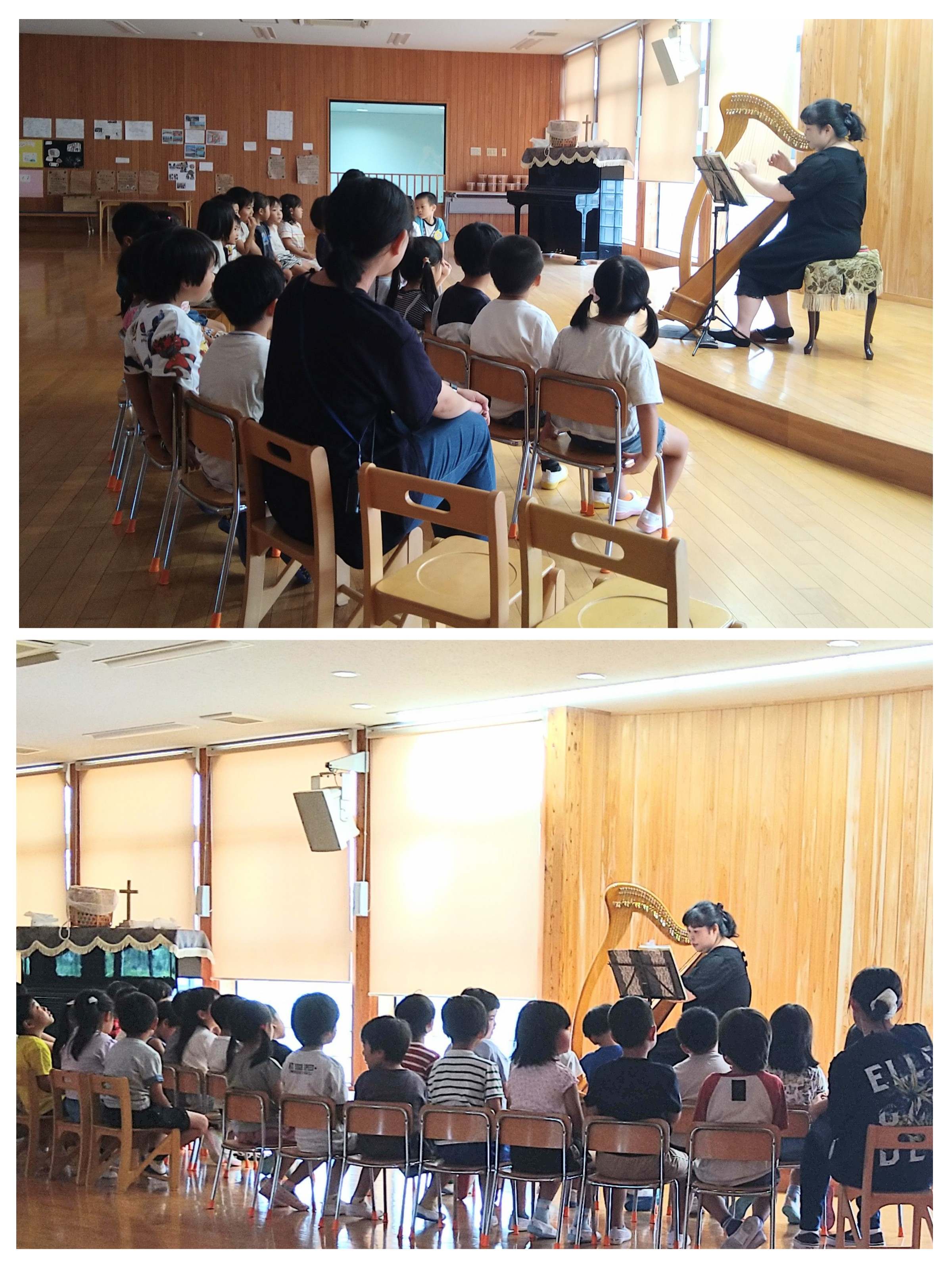 今日は、4・5歳児がハープコンサートを聴きました。今年度は7回予定しているハープコンサートも4回目(4・5歳児は2回目)となり、涼しく準備されたホールでは、ハープの演奏を聴きながら涼しい一時をこの季節ならではの曲で楽しませていただきました。