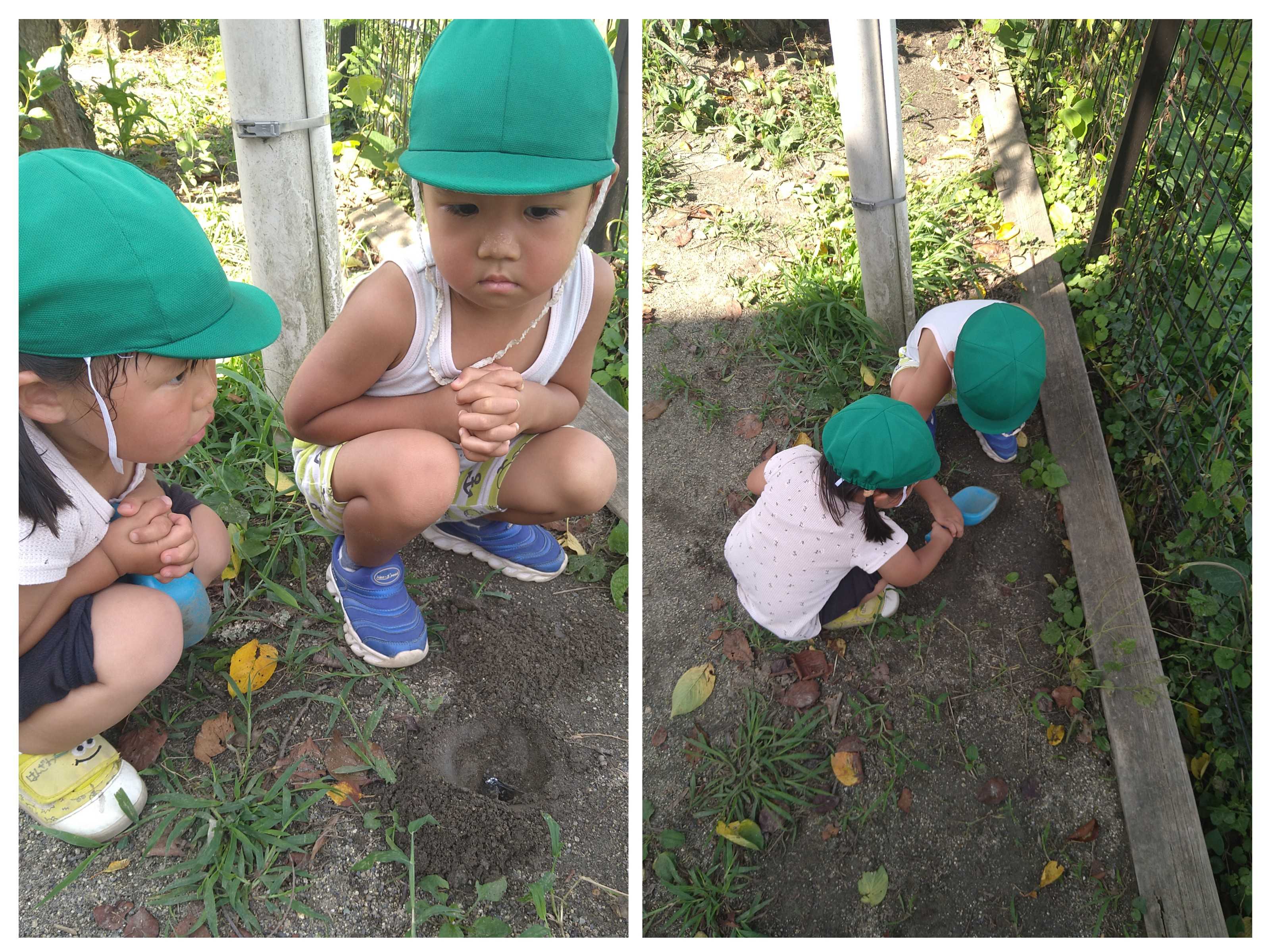 3歳ひつじ組のR君は死んだセミの羽根を持ち、「園長先生どうする?」と。少し話をしてから、土に埋めてあげることにしました。そこに同じクラスのYちゃんも加わり一緒にお祈りをして、土に埋めてあげました。