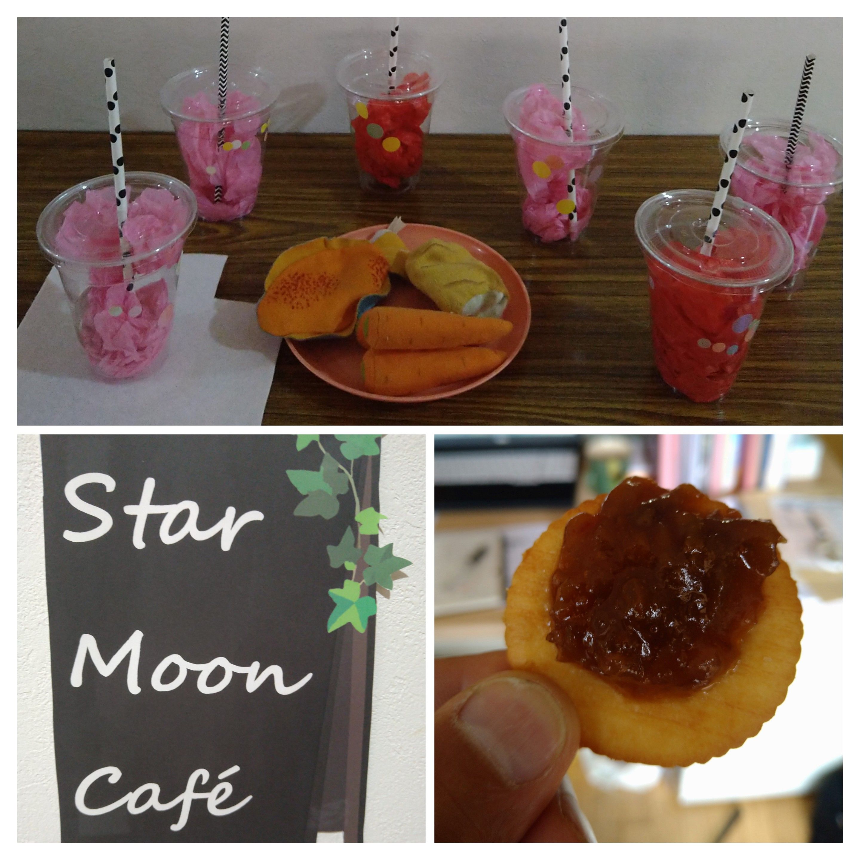2歳児つき組・ほし組では、StarMoonCaféをオープンさせ、美味しそうなジュースを提供しています。職員室には手作りの梅ジャムクラカーの差し入れもありました!送迎の際は、ぜひお立ち寄りください!