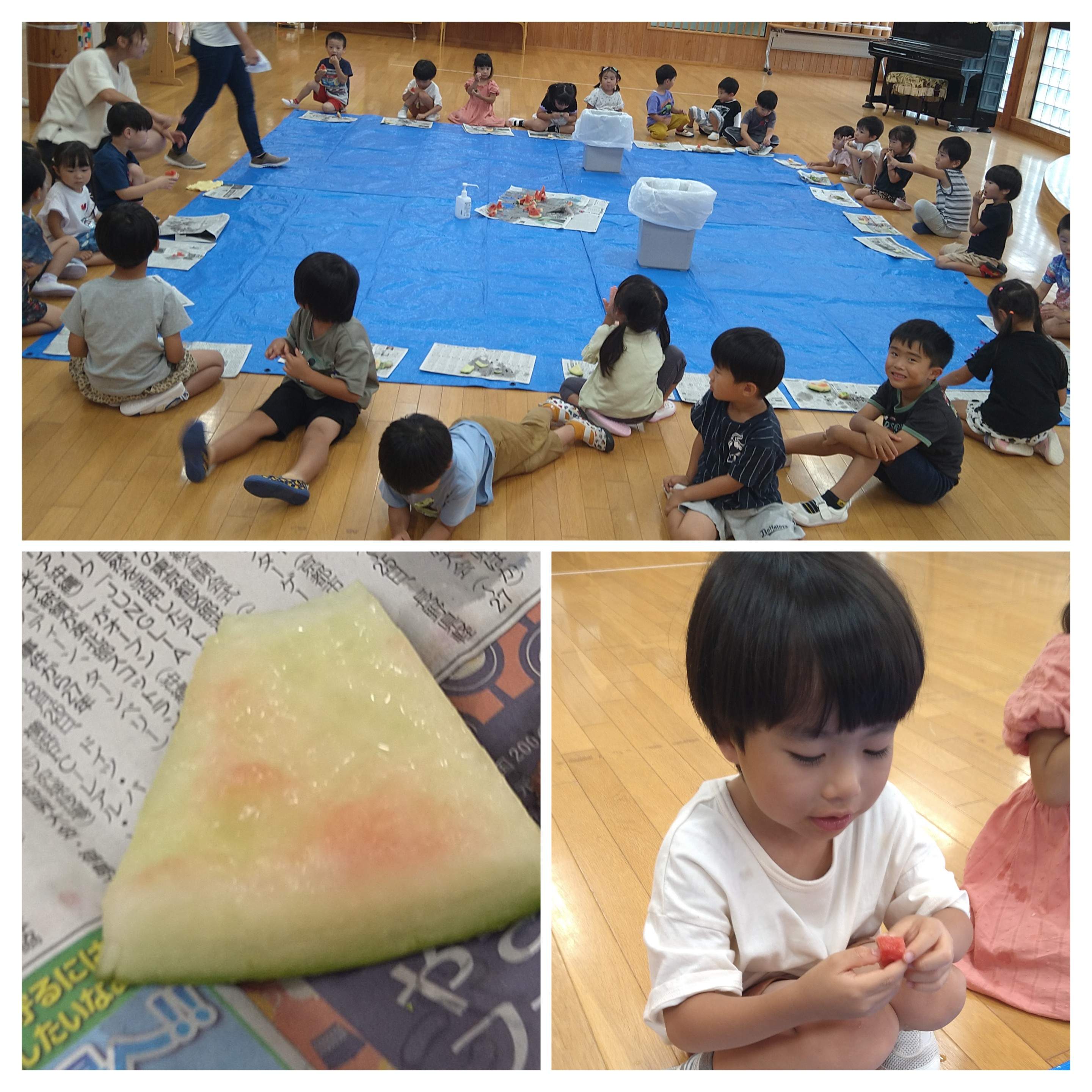 先日、4歳児はと組・あい組では、園の畑で収穫したスイカをスイカ割をして味わいました。みんな果肉の赤い部分を通り越して、白い部分も「あ~おいしい!」と喜んでいました。