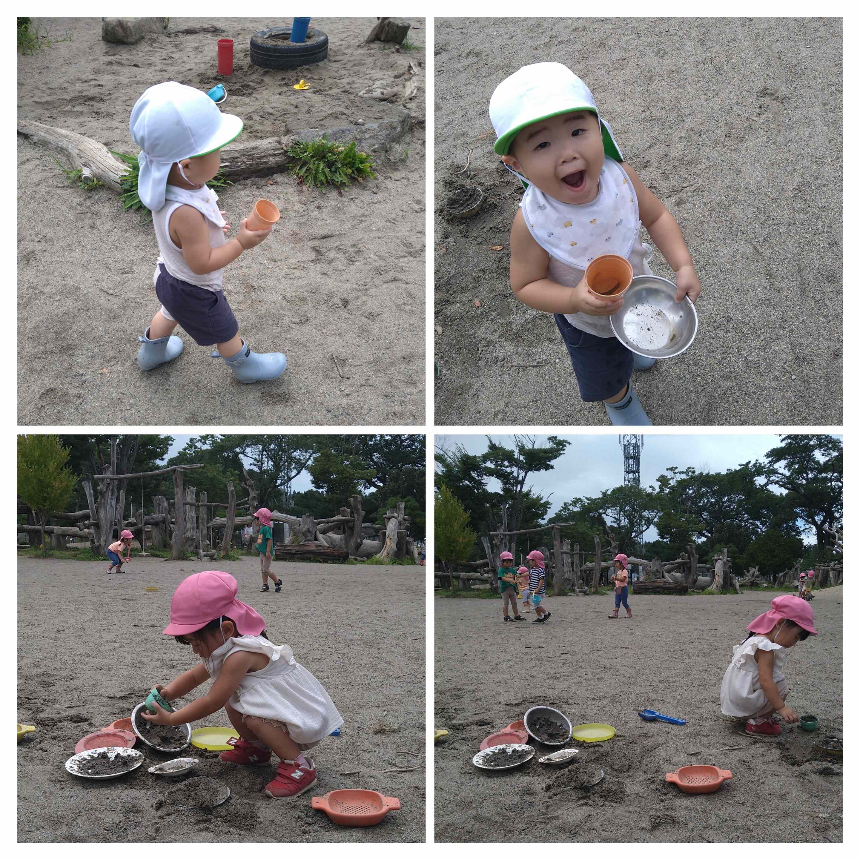 1歳児のR君は、砂場で見つけた石ころを1つ1つ「じーっ」と見てはポイっと投げる事をしていました。傍にいくと「あっち!(熱い)」と言って投げているようでした。やけどするほどの熱さではありませんが、この暑さで土も砂も温められ、その変化に気づいたのでしょうか?