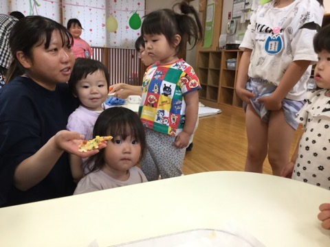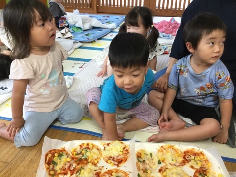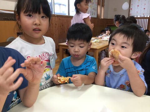 ピーマンは、そら組さんが育ててくれていたので、ピザをおすそ分けしました。急にのぞみ組が行ったので、おそるおそるでしたが(笑)夏の野菜を「おっし!!(おいしい)」と言って食べてくれました。