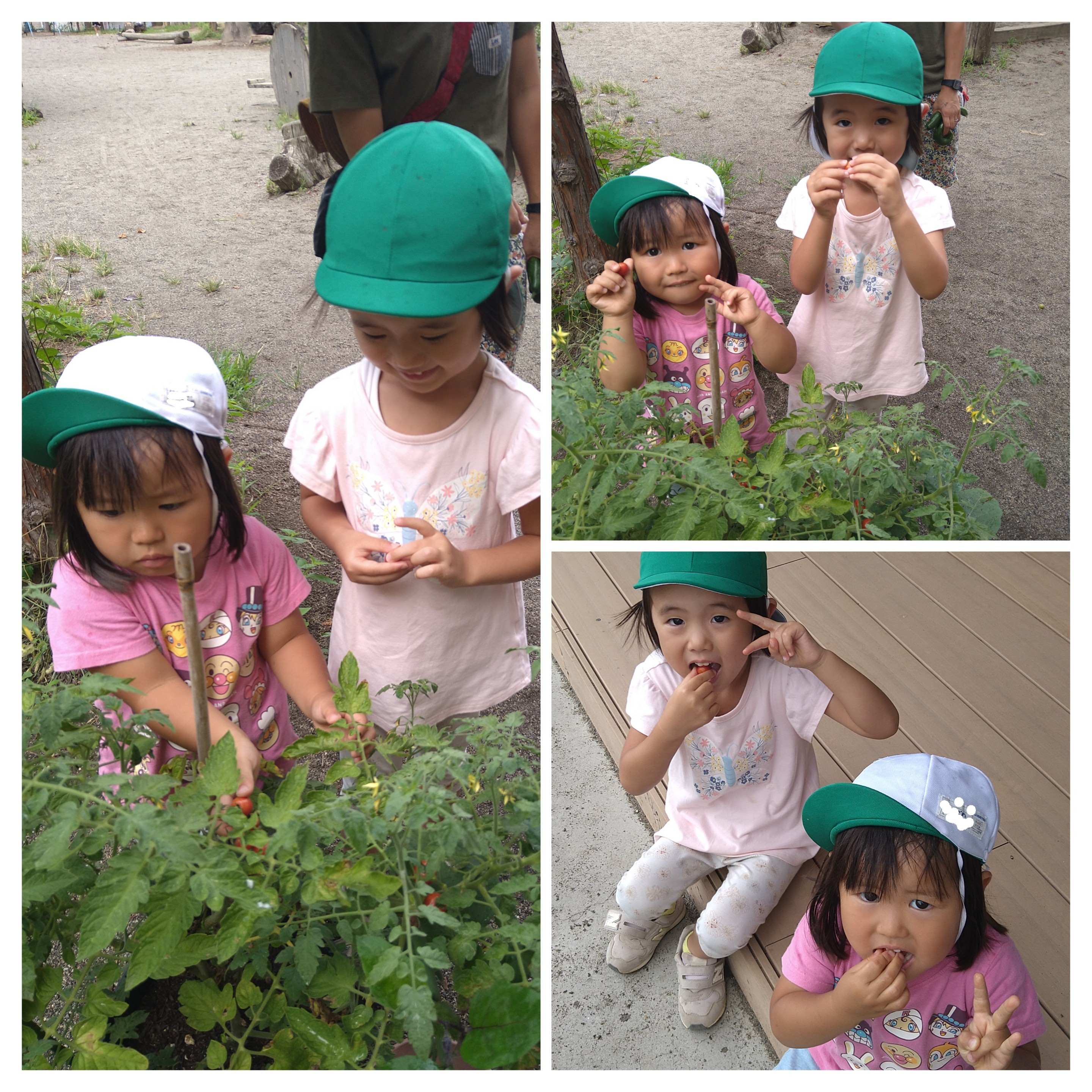 3歳児ひつじ組の女の子2人は、たくさんなっているミニトマトを「どれにしようかな~」と選ぶのも嬉しいし、食べるのも嬉しい!といった感じでした。