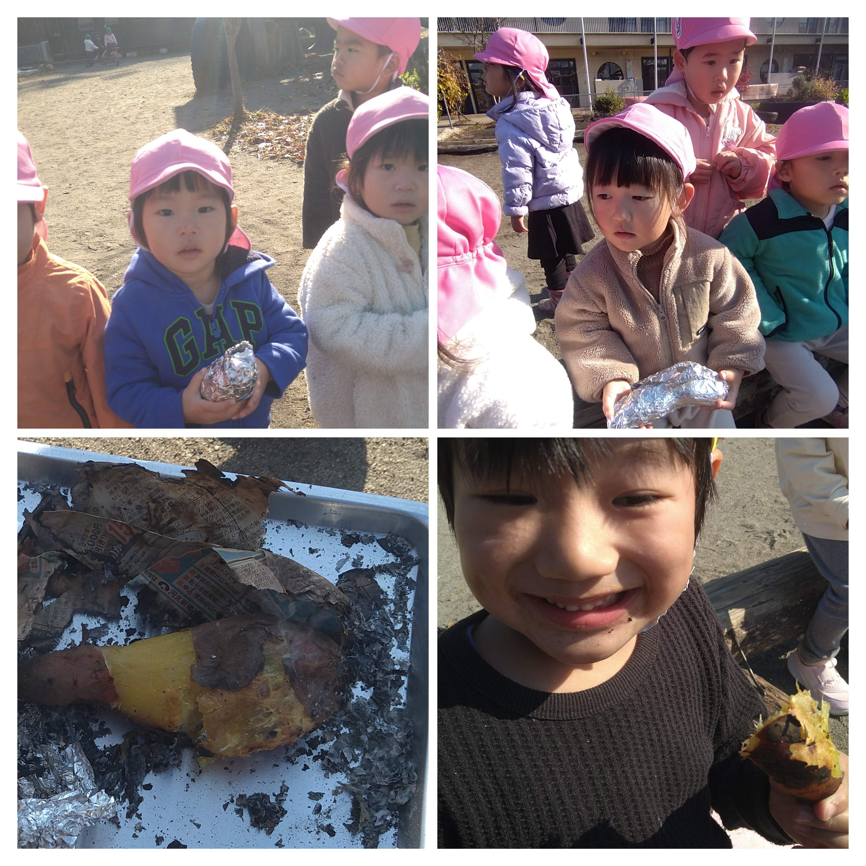 昨日は園庭でやきいもをしました。寒い日でしたが、焚火で温まりながら「まだかな~まだかな~」と待つ子どもたち。日頃から杉の葉や落葉、小枝を準備ていました。さつま芋掘りの時からやきいもを楽しみにしていたので、どの子も笑顔で味わっていました。「美味しい!」と笑顔でほおばるのは、はと組のK君。