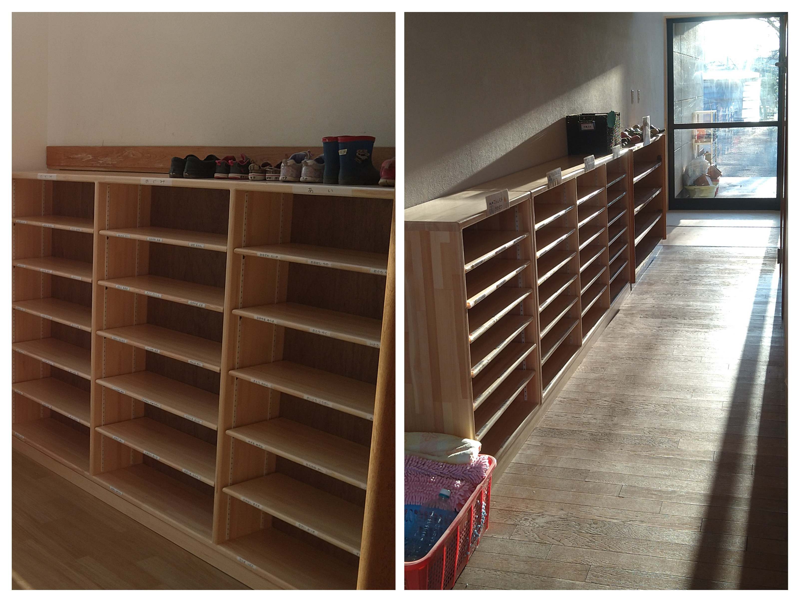 11月下旬から工事をしていた西側玄関に新しい靴箱が設置されました。早速先生たちが子どもたちの名前を貼ってくれて、新年から使い始めます。玄関の幅も広くなり、元気に園庭に駆け出していく子ども達が目に浮かびます。