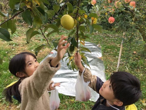 一面に広がるりんごの木に「すごい」と興奮していました。真っ赤になったりんごを探して吟味して収穫していました!